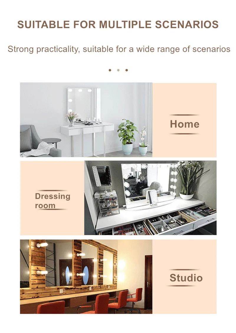 * Светодиодный зеркальный светильник Vanity в голливудском стиле, новейший дизайн, усовершенствованная версия, более красивый и удобный.* Usb-порт, лампы и источник питания могут быть подключены через USB многими способами, такими как ноутбук, блок питания, розетка, поэтому это очень удобно при использовании.* Регулировка яркости, яркость может регулироваться от яркого до темного, от темного до яркого, в соответствии с вашими потребностями.* Он оснащен функцией памяти, записывает последний режим освещения, когда вы используете его, и это тот же режим освещения, когда вы используете его снова.* Максимальное расстояние между двумя лампами составляет около 33 см, что делает его подходящим для большинства зеркал.• Длина провода регулировки, минимальное расстояние между двумя лампочками может быть сократилась к составляет около 1,7 см, если вы думаете, что это слишком закрыт, он может быть удлинен, в соответствии с вашими запросами, очень прост в эксплуатации.* Самое главное, чтобы лишние провода были скрыты в лампочках, которые не видны снаружи, чтобы ваше зеркало было аккуратным, красивым и элегантным.* Предоставляются двухсторонние ленты, лампочки могут быть непосредственно и быстро наклеены на зеркала с помощью лент.* 12 В постоянного тока входное напряжение, безопасно для использования.* Хороший охлаждающий эффект, энергосбережение, длительный срок службы.* Мягкий светильник, высокая светоотдача, отсутствие теплового излучения, отсутствие мерцания, отсутствие пятен, защита глаз, Профессиональный светильник для макияжа.* Используется для макияжа, заполняющий светильник, украшение, зеркальная декоративная лампа, лампа для украшения сцены, лампа для украшения шкафа, студийная декоративная лампа и так далее.* Подходит для свадьбы, дня рождения, Дня Святого Валентина и других праздников.