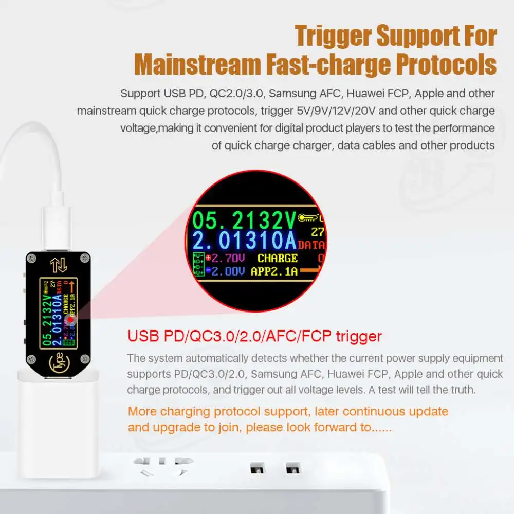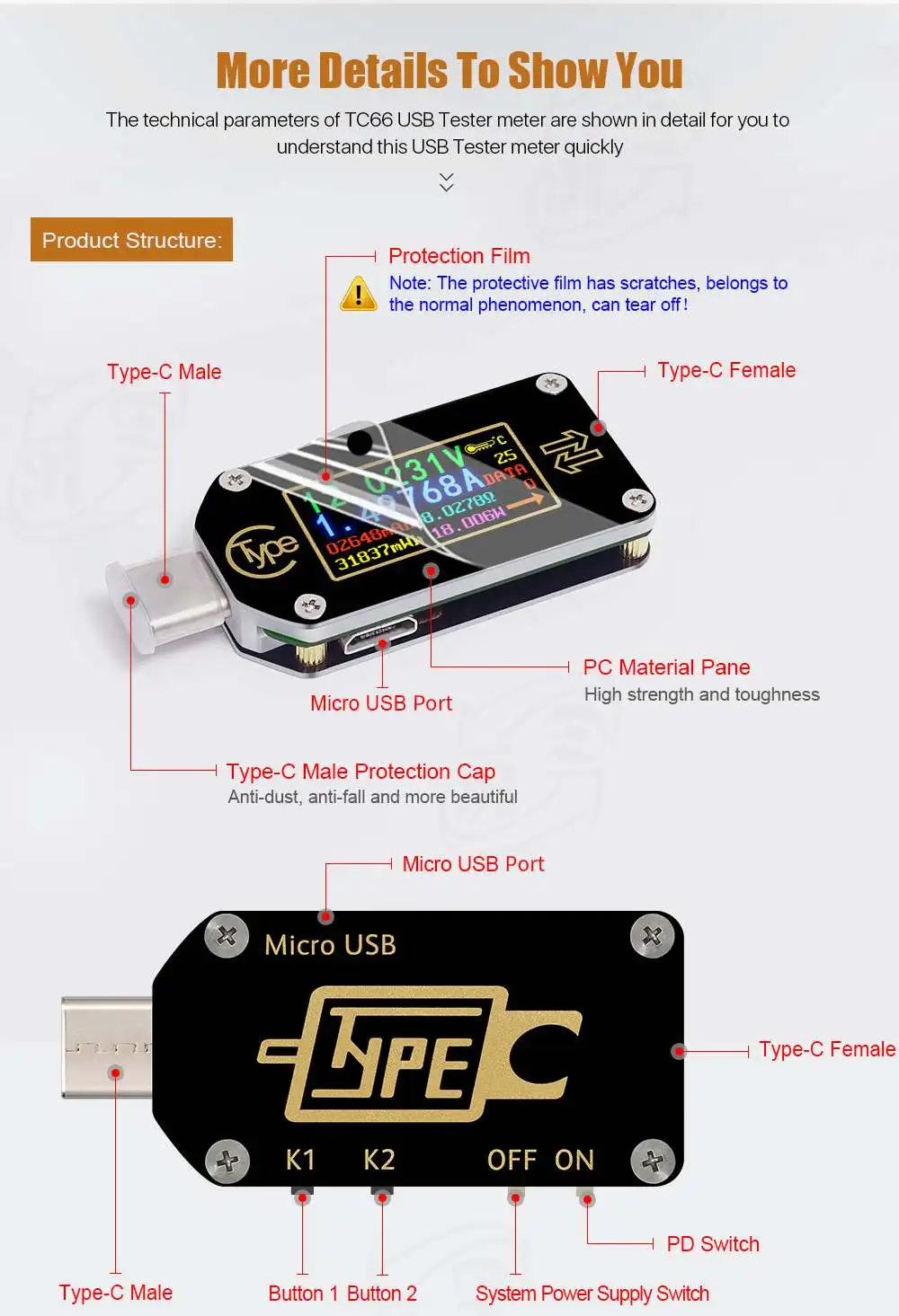 1. Обнаружение поддерживаемого/неподдерживаемого протокола быстрой зарядки2. TC66(C) может временно хранить данные о напряжении/токе и просматривать данныеPCsoftware/APP при подключении.3. Триггер/Операция Декорации/пусковая операция PD4. Регулировка яркости экрана5. Поворот направления экрана6. Выбор режима линии CC7. Выбор языка8. Сброс9. Проверьте номер серии продуктов/номер версии прошивки/загрузкуВремя работы10. Только показывают измерение напряжения/Измерение тока/мощностьИзмерение/направление тока при простом измерительном интерфейсе