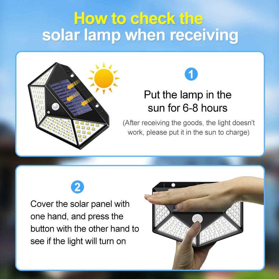 1: Поместите лампу на солнце для зарядки менее 8 часов. Пожалуйста, убедитесь, что солнечная панель полностью подвержена воздействию солнца. 2. Нажмите кнопку лампы, чтобы включить лампу в тусклой среде или закрыть солнечную панель одной рукой и нажмите кнопку другой рукой