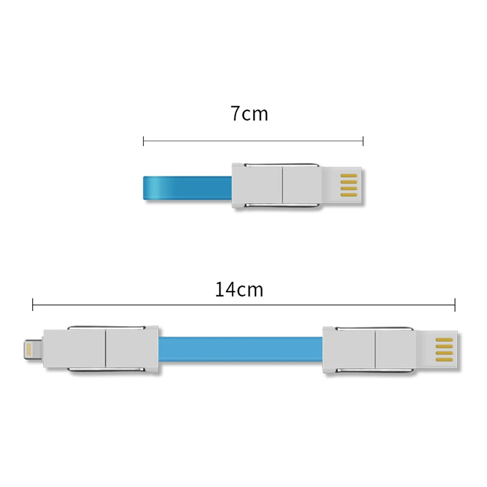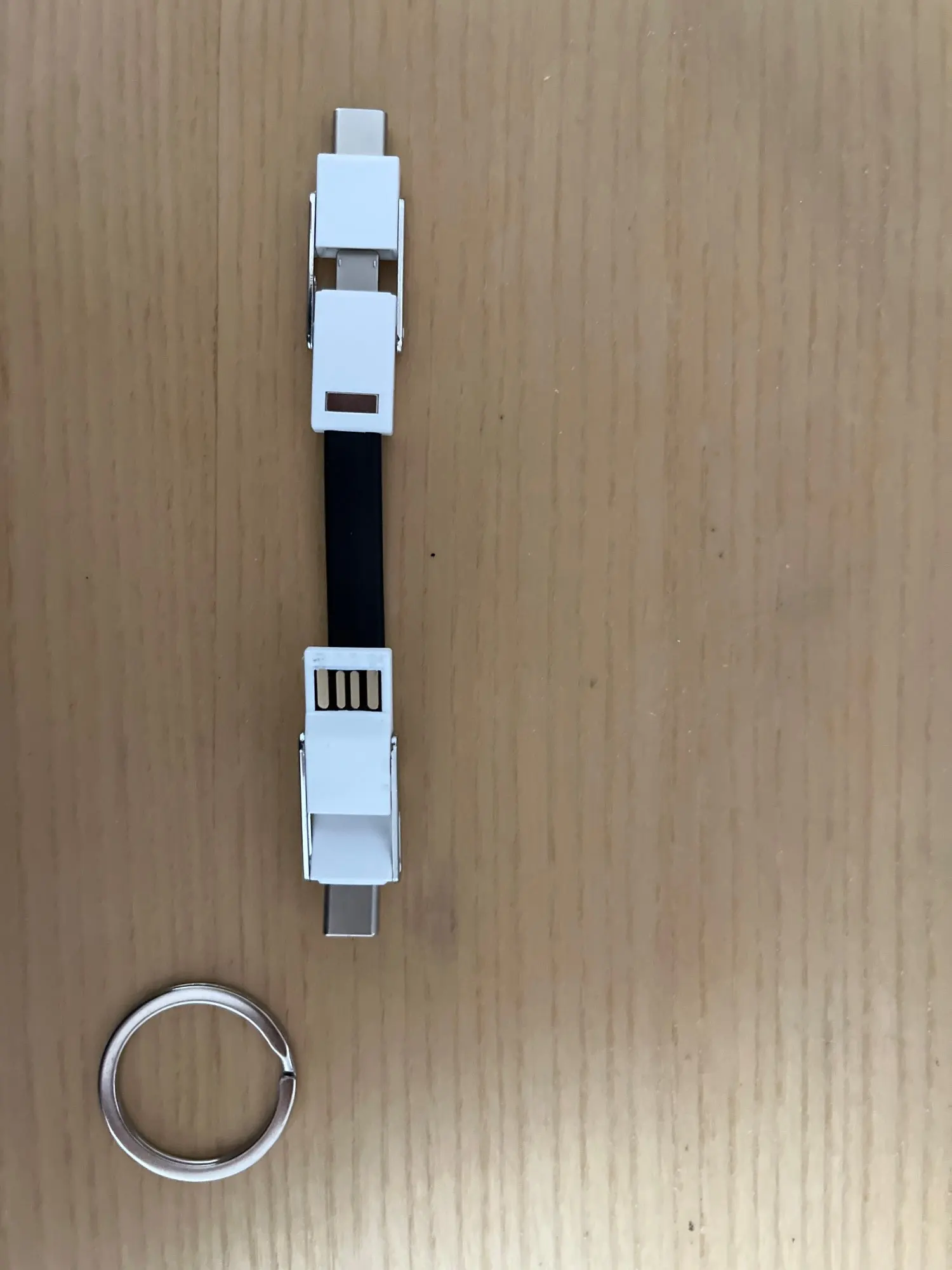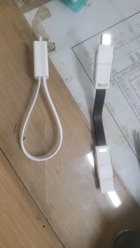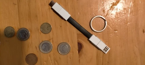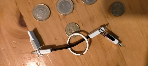 Я попробовал, и все соединения работают. Кабель короткий, но для сочетания с внешней батареей он довольно удобный. Он не громоздкий и ничего не весит и очень удобен в носке. Он поставляется с двумя магнитами на голове, чтобы закрыть его вокруг кольца и носить его как брелок. Магниты также служат для переноски, приклеенных к чем-то металлическому. Я не знаю, насколько будут устойчивы детали, где вращаются детали.