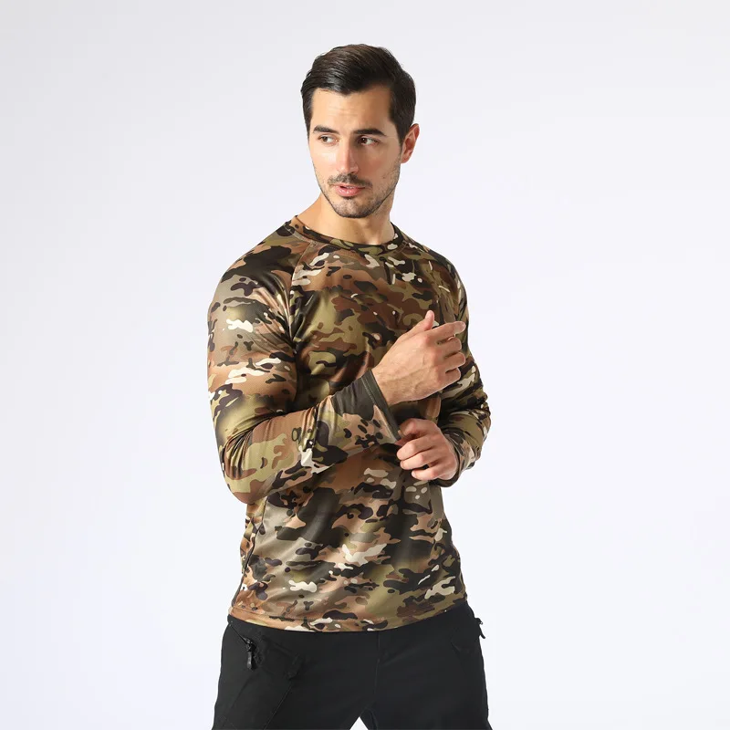 Быстросохнущая тактическая камуфляжная футболка для мужчин, дышащая футболка с круглым вырезом и длинными рукавами для охоты, военные камуфляжные военные футболки