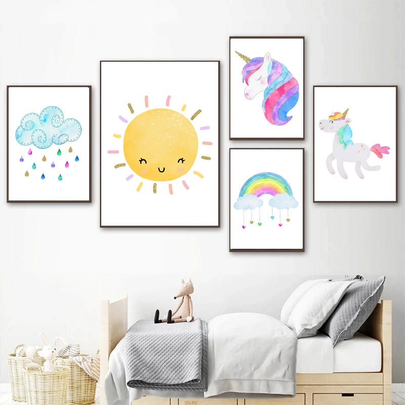 Радуга облака солнце Единорог детская настенная Картина на холсте постеры и принты настенные картины декор для детской комнаты