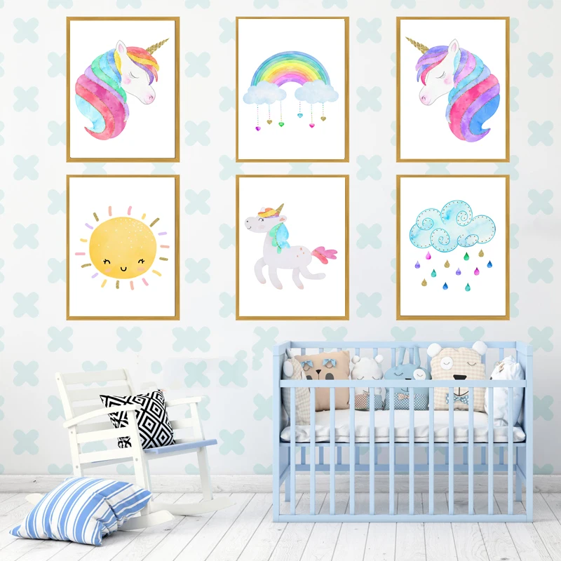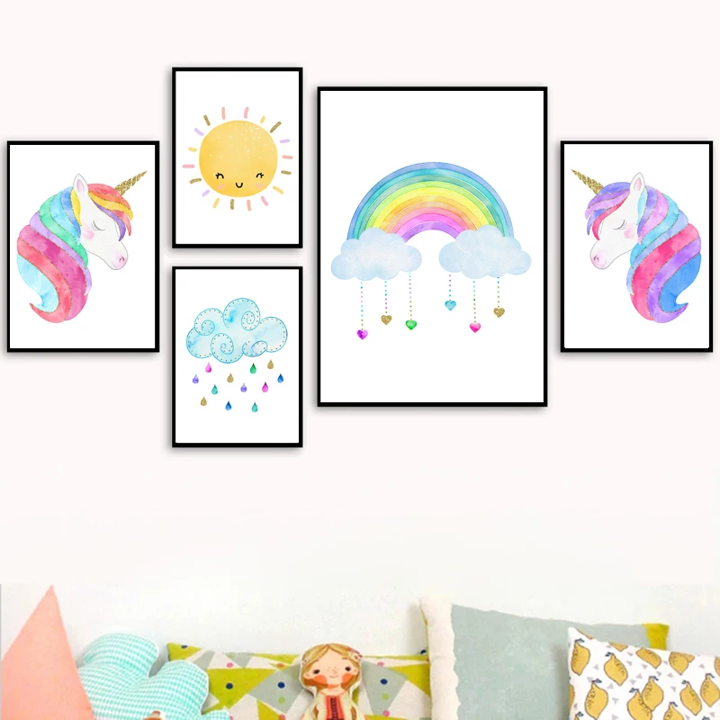 Единорог облако Радуга стены искусства холст живопись Детские плака...