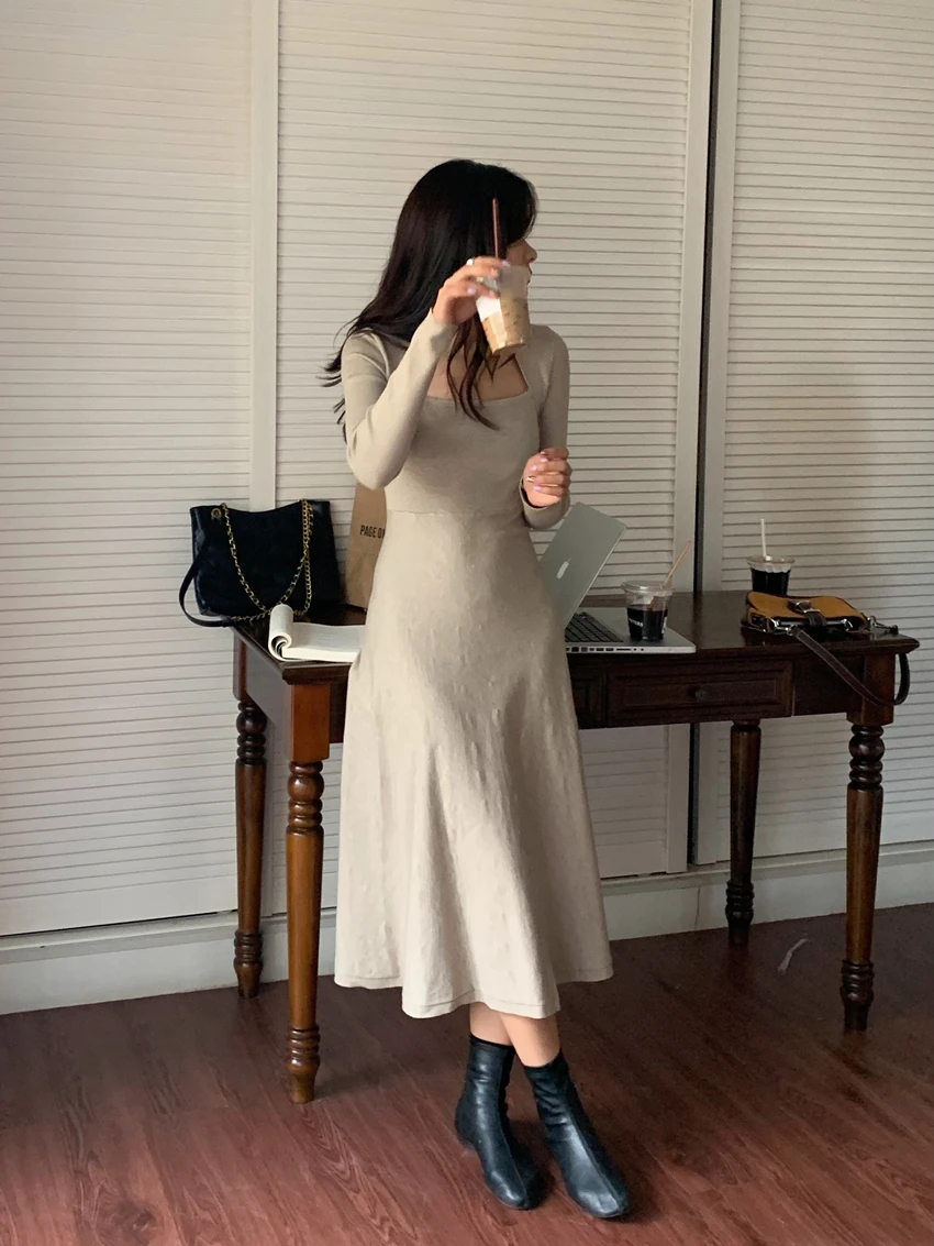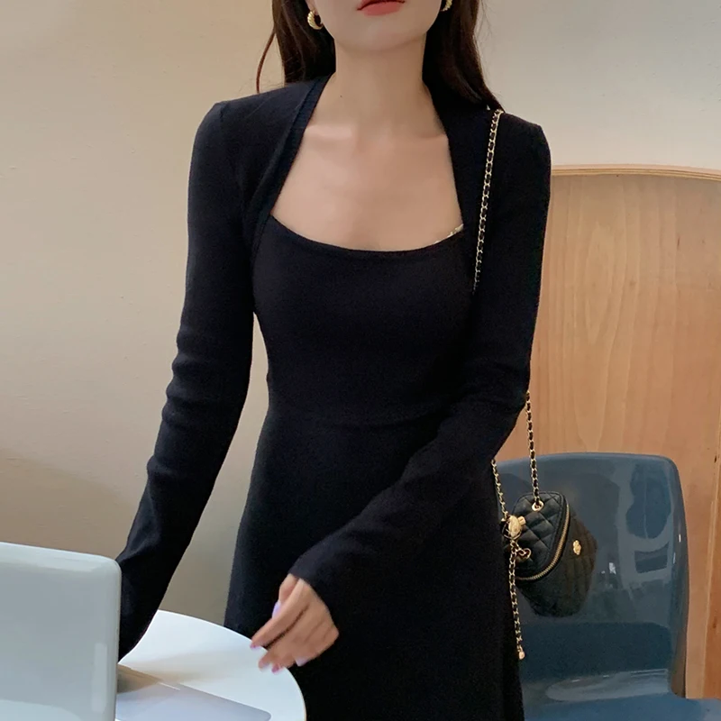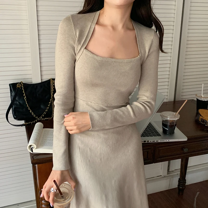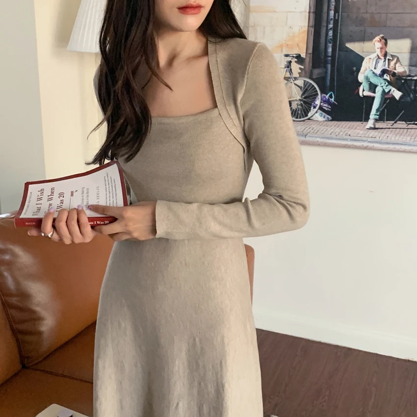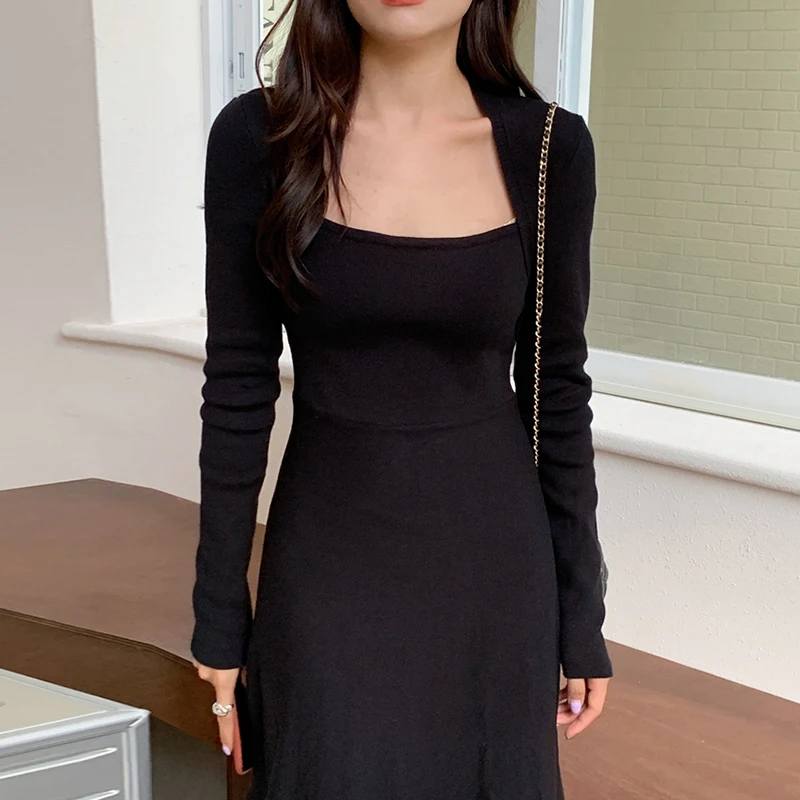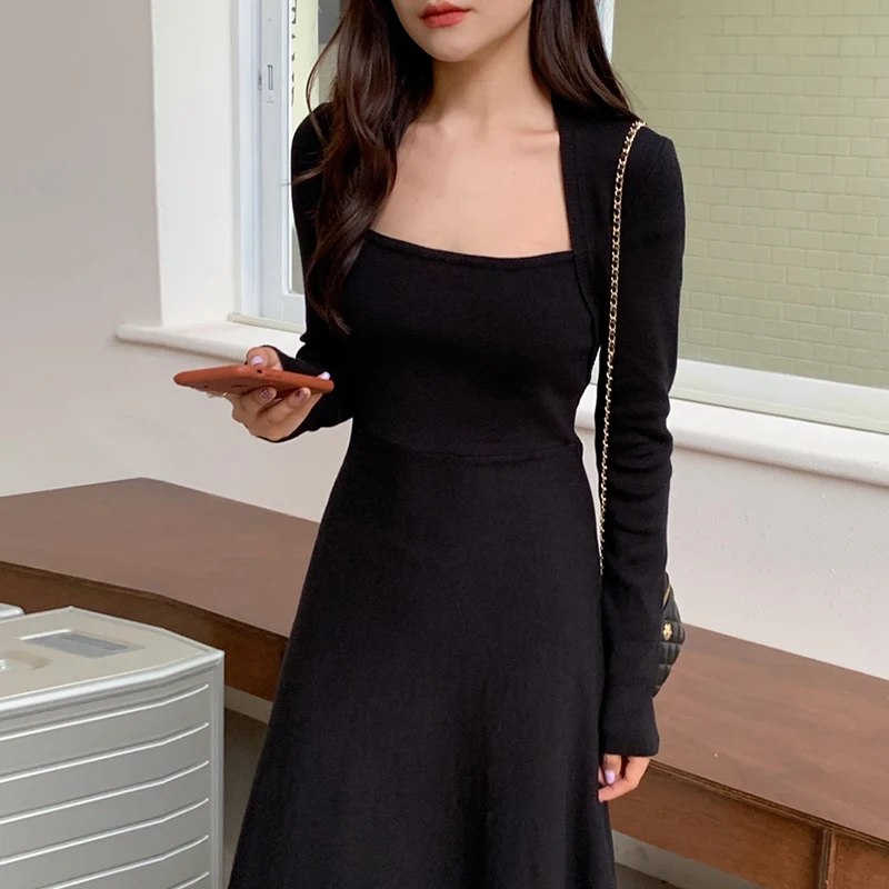Повседневные вязаные Элегантные зимние платья с квадратным вырезом и высокой талией, теплые платья-свитеры 2021, женское плотное однотонное платье-свитер в Корейском стиле для женщин