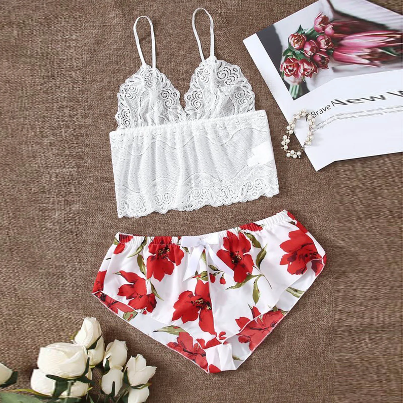 Пижама женская атласная шелковая, пикантное нижнее белье с цветочным принтом, кружевной комбинированный костюм из двух предметов, топ на бретельках и шорты, домашняя пижама