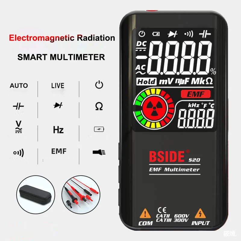 2-в-1 адаптер EMF с мультиметра: цифровой тестер имеет функцию электромагнитного поля детектор излучения и универсальный счетчик, который очень подходит для профессионалов, так и для домашнего использования.Многофункциональный мультиметр с широким диапазоном испытаний: Универсальный измеритель может измерять напряжение переменного/постоянного тока, сопротивление, емкость, частоту, диод, непрерывность, распознавание firewire и т. д.Домашнее Обнаружение электромагнитного излучения: верхняя Индукционная зона для идентификации высокочастотного электромагнитного излучения, излучаемого микроволновой духовкой, электрическим вентилятором или кондиционером. И имеет значок и на каждый день, 3 цвета Аналоговая гистограмма отображается после того, как электромагнитное излучение, звуковым сигналом одновременно.Смарт-Функция s: автоматическое определение напряжения переменного тока, напряжение постоянного тока, сопротивление на автоматическом режиме; Измерительный диоды для подавления переходных скачков напряжения в 1,0 V; В тех случаях, когда сопротивление меньше, чем 30Ω, звуковой сигнал будет звучать при функции непрерывности; И звуковой сигнал будет звучать при распознавании сигнала прямого напряжения.Литий-ионный Аккумулятор: встроенный литий-ионный аккумулятор емкостью 800 мА · ч, удобный в использовании и перезарядке. Автоматическое отключение при отсутствии входного сигнала в течение 5 минут.Высокая точность Дисплей: автонастройка с 9999 подсчитывает смарт-мультиметр с фиксация данных функция, и 3,5-дюймовый большой EBTN цветные ЖК-дисплей значительно повысить опыт чтения, значение очень легко читать даже под солнечный светильник или плохой светильник.Гарантия безопасности: с полным диапазоном измерения защита от перегрузки, двойная защита от изоляции, CAT.II 600V и CAT.III 300V уровень безопасности.Карманный цифровой Ручной EMF мультиметр: компактный портативный размер разработан со съемным прочным рукавом и мешочком для хранения для защиты от ударов, трения и ударов.