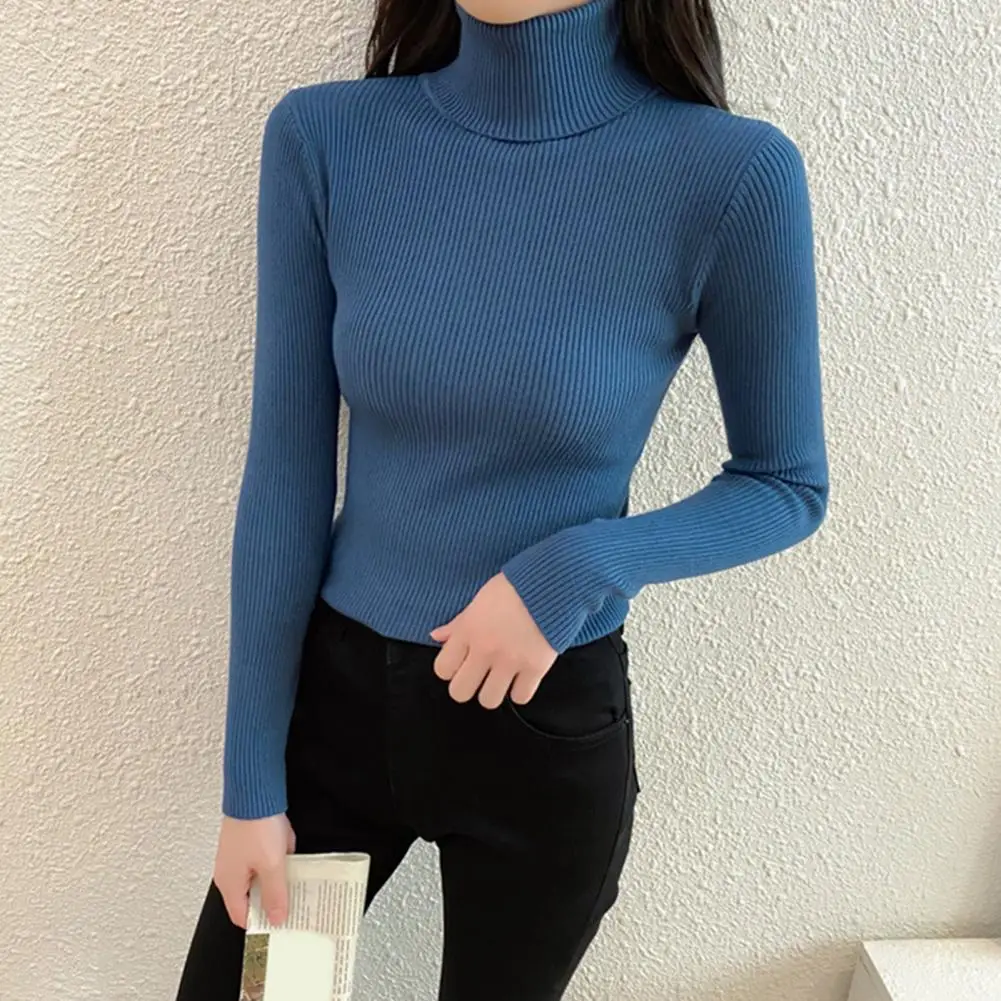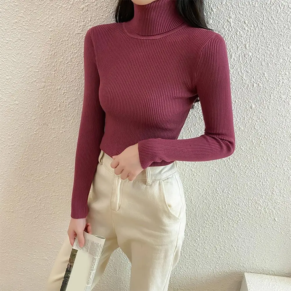 Однотонный вязаный свитер с высоким воротником, сезон осень-зима, облегающий свитер в рубчик с длинным рукавом, женская одежда