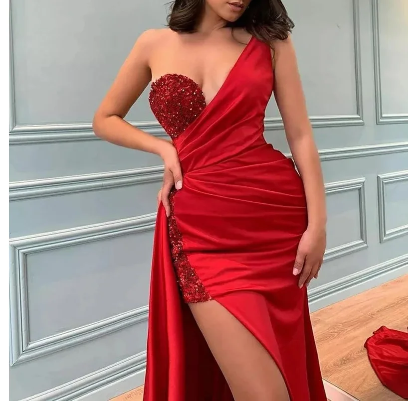 Женское вечернее платье с юбкой-годе, красное блестящее длинное платье на одно плечо с разрезом сбоку, со складками и шлейфом, для вечеринки и выпускного вечера, 2022
