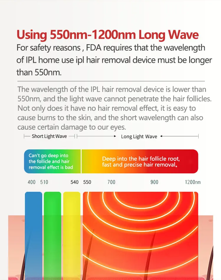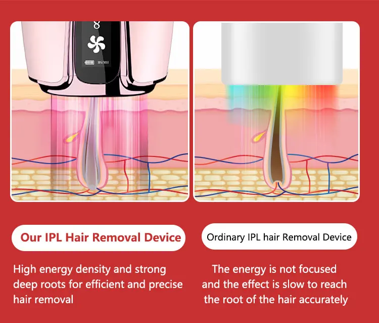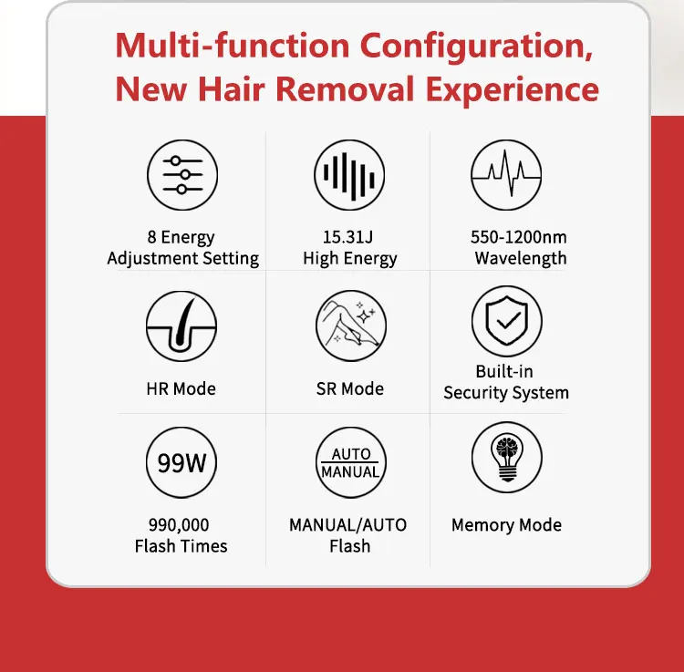 【Эффективная и постоянная система удаления волос IPL использует те же клинически проверенные технологии IPL, которые используются дерматологом и салонами красоты. Принцип заключается в том, чтобы излучать сильный пульс и поглощаться волосяным фолликулом, стимулирует волосяной фолликул, чтобы войти в спящий период для достижения постоянного удаления волос.【Нежный и безболезненный 】ipl удаление волос излучает теплый светильник, и кожа ощущается только в тепле. Он очень нежный, особенно для первых пользователей или работает на нежных областях, таких как лицо или Линия бикини.【 8 уровней и 2 режима 】 8 различных уровней энергии для адаптации кожи. Вы можете регулировать уровень в соответствии с областью кожи и скоростью роста волос. В первый раз мы предлагаем начать с уровня 1, чтобы привыкнуть к устройству и мигать. Два режима дизайна могут удовлетворить ваши требования к различным частям для удаления волос. Ручной режим в основном используется для удаления волос на небольшой площади, такой как линия бикини, подмышка, пальцы, губы; Автоматический режим используется для большой области удаления волос, таких как руки, ноги, живот и спина.【 990000 вспышек и отсутствие дискретных требований 】 990000 вспышек достаточно для пожизненного времени. Следуйте инструкциям руководства, чтобы правильно использовать Удаление волос IPL, это поможет вам быстрее удалить волосы.【Экономичное решение для дома-по сравнению со стоимостью методов удаления волос в салоне, финансовые преимущества этого устройства для удаления волос в доме скоро будут видны. Профессиональный производитель и строгий контроль качества делают нас уверенными в нашем домашнем использовании в домашнем лазерном удалении волос.