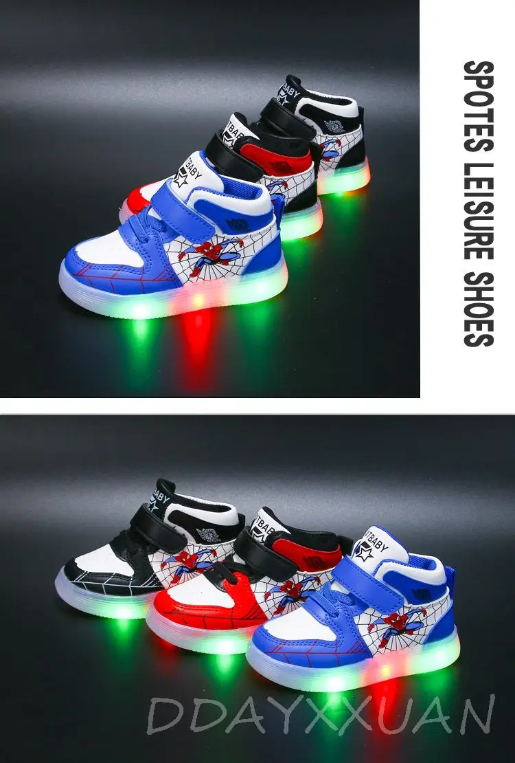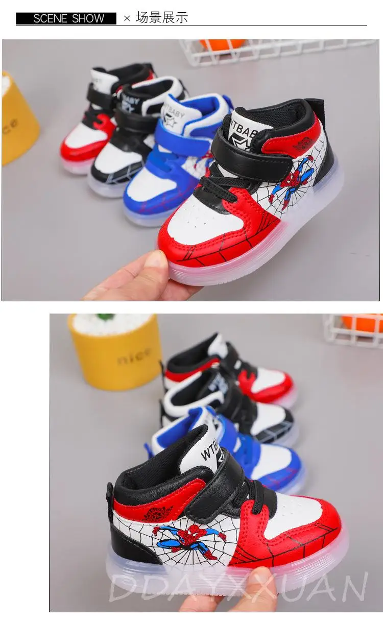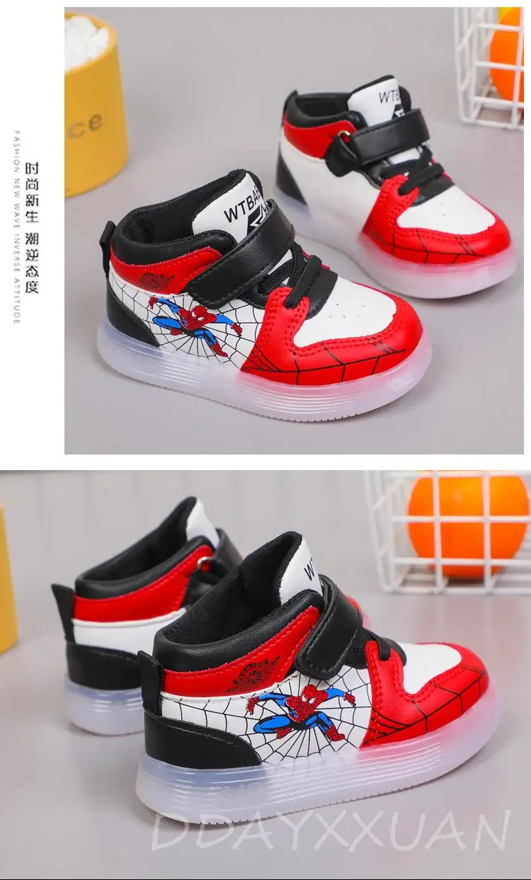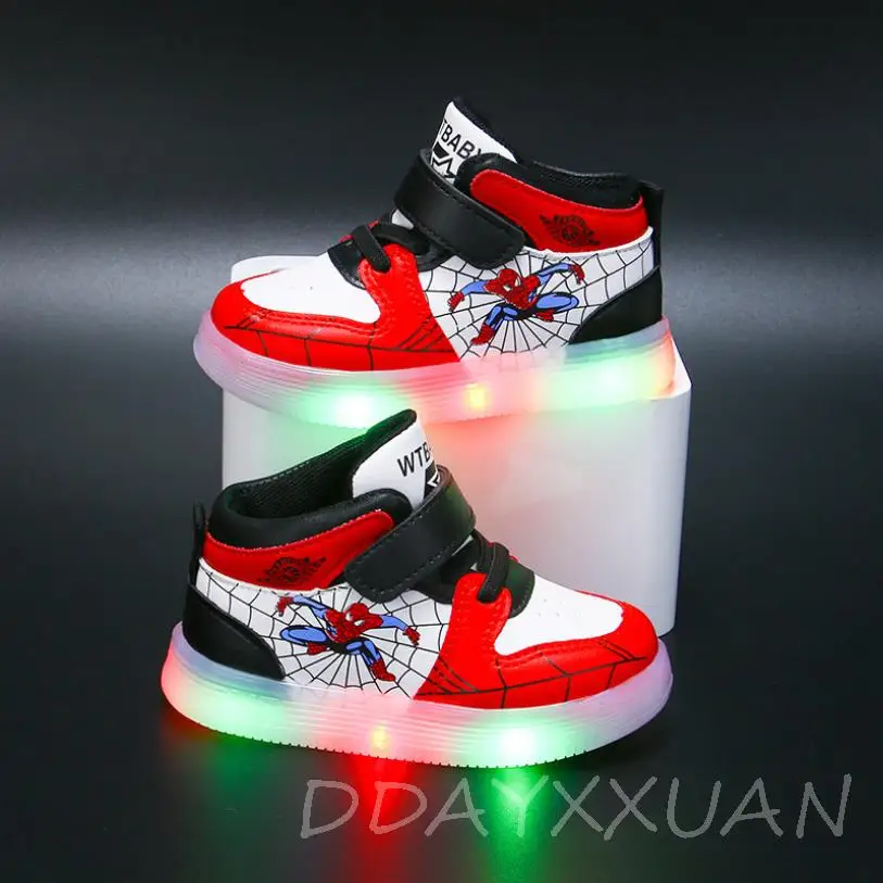 Детские кроссовки со светодиодной светильник кой, мягкая подошва, мультяшный Человек-паук, повседневная обувь для мальчиков и девочек, размер 21-30, диснеевские