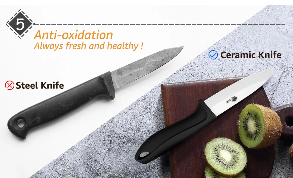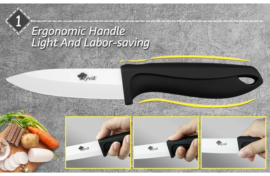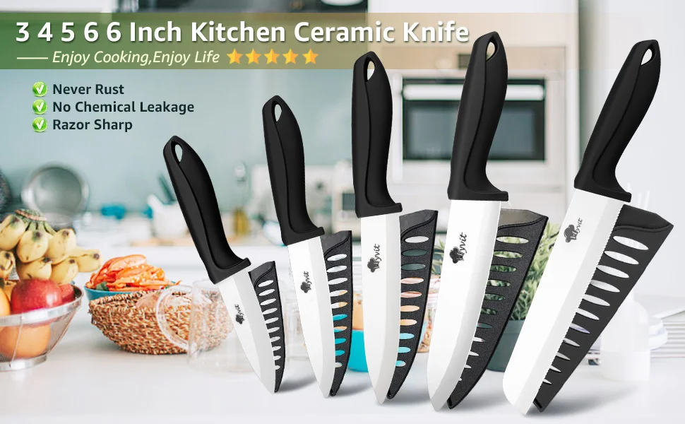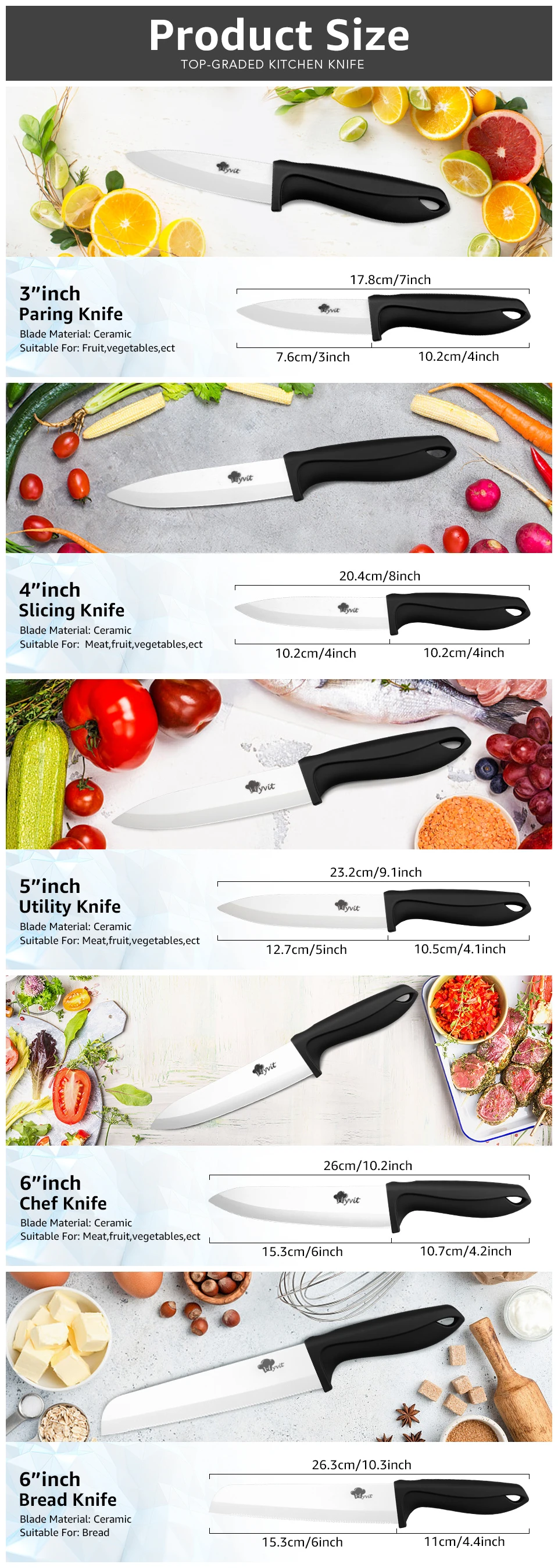 Керамические ножи должны использоваться только на деревянных, пластиковых или бамбуковых разделочных досках. Использование этих ножей на стекле, мраморе или плитке может привести к тому, что лезвия будут чипеть или сломаться. Эти ножи идеально подходят для резки фруктов, овощей и мяса без костей. Не используйте эти ножи для резьбы, склеивания или подделки. Это может повредить ножи.