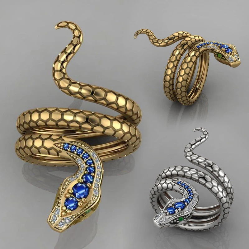Женское кольцо Стразы питон, элегантное золотистое кольцо со змеей синего цвета, банкетное украшение для вечеринки, мужское кольцо в стиле хип-хоп, рок, подарки с изменяемым размером