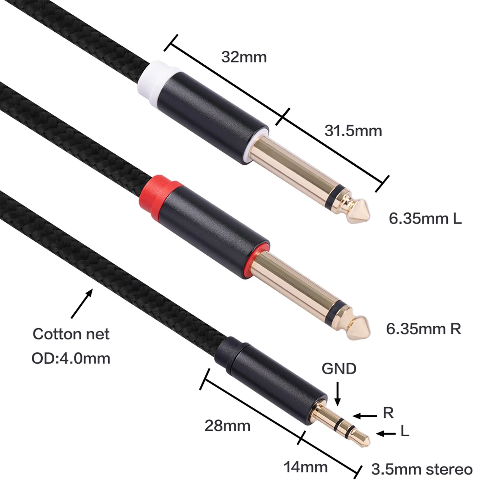 Позолоченный штекер, хорошая контактная производительность, защита от окисления С хлопковой тканой сеткой, она имеет сильную прочность на растяжение и красивый внешний вид Корпус изготовлен из окислительного сплава алюминия, который имеет хорошее ощущение руки, прочный и долговечный Доступны различные длины, подходят для различных случаев 3,5 стерео двойной 6,35 подойдет как для повседневной носки, так кабель, данный кабель используется для подключения вашего смартфона, портативный медиаплеера, ноутбук/ПК или другое устройство с 3,5 мм интерфейс jack выход 2x6,35 мм Джек Вход устройств, таких, как колонки, смешивая консолей и т. д Этот кабель может использоваться для разделения 3,5 мм несимметричный стереосигнала во двух 6,35 TS (слева/справа) несимметричный подойдет как для повседневной носки, так сигналов или скомбинировать два 6,3 подойдет как для повседневной носки, так сигналы (слева/справа) В рамках одного 3,5 мм стерео сигналаХарактеристики: