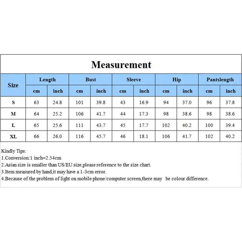 Блок: 2 шт./компл.Размер:(S) Длина топа-63 см, обхват груди-101 см, рукав-43 см, длина брюк-96 см, обхват бедер-94 см(M) Длина топа 64 см, обхват груди 106 см, длина рукава 44 см, длина брюк 98 см, обхват бедер 98 смДлина топа 65 см, обхват груди 111 см, длина рукава 45 см, длина брюк 100 см, обхват бедер 102 см(XL) Длина топа 66 см, обхват груди 116 см, рукав 46 см, длина брюк 102 см, обхват бедер 106 смОсобенности: 1 см = 0,393 дюйма, 1 дюйм = 2,54 смСовет:1. Напоминаем, что из-за световых эффектов, настроек яркости/контрастности монитора и т. д. могут быть некоторые незначительные различия в цветовом тоне фотографии на сайте и фактического товара.2. Изделие измеряется вручную, оно может отличаться на 1-3 см, ваше понимание будет высоко оценено.