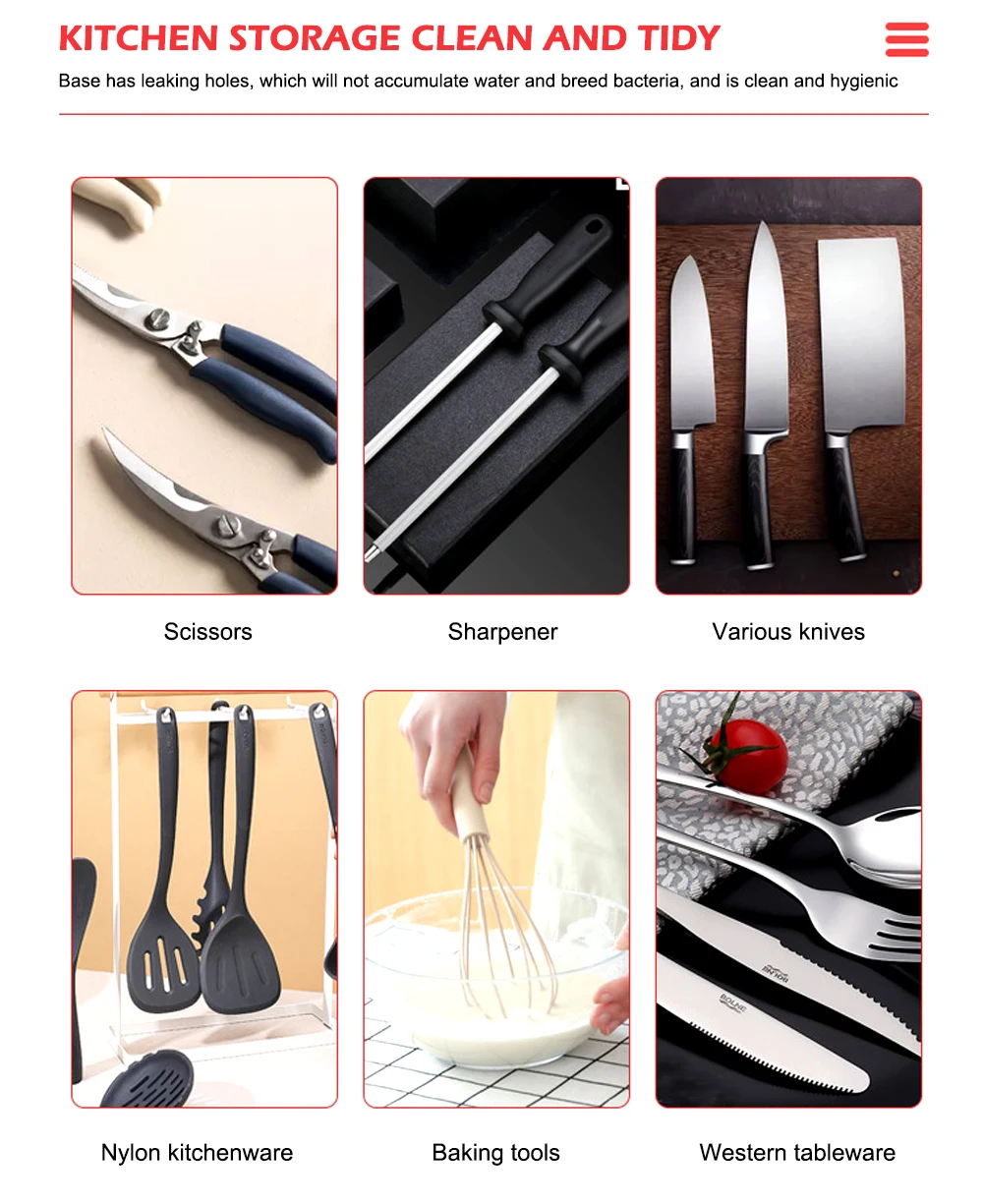 Новый дизайн Держателя Ножа имеет функциональный и компактный дизайн. Экономит драгоценное пространство во время приготовления пищи и оставляет дополнительную комнату для кухонной утвари и аксессуаров. Параллельные отверстия отделяют края ножа, чтобы ножи не прикасались друг к другу. Нет потенциального риска повреждения краев ножа в блоке ножа.