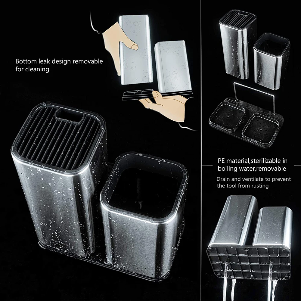 В нижней части держателя ножа и держателя посуды есть сливные отверстия. Это помогает сливать воду после того, как вы только что помыли ножи. Просто протрите поверхность из нержавеющей стали или прорезиненную подкладку, чтобы сохранить ваш нож в чистоте.