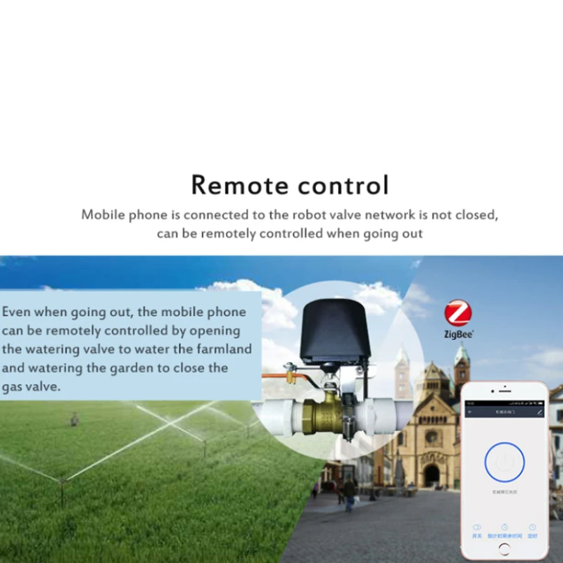 Клапан питания TUYA, вы можете закрыть или открыть клапан автоматически с помощью смартфона независимо от того, где вы .. Когда-либо, если вы находитесь вдали от дома, мобильный телефон можно дистанционно управлять, открыть клапан полива, чтобы поливать фермы, поливать сад и закрыть газовый клапан.