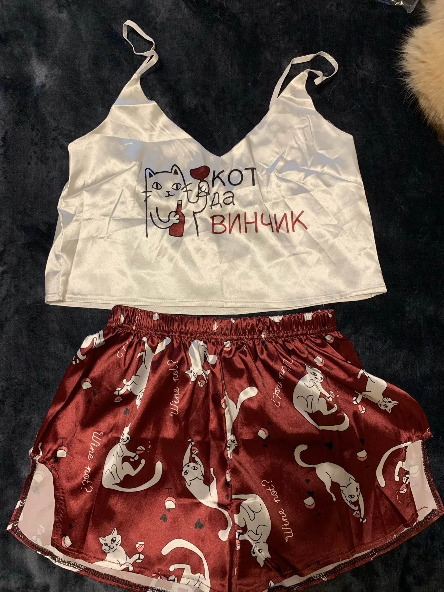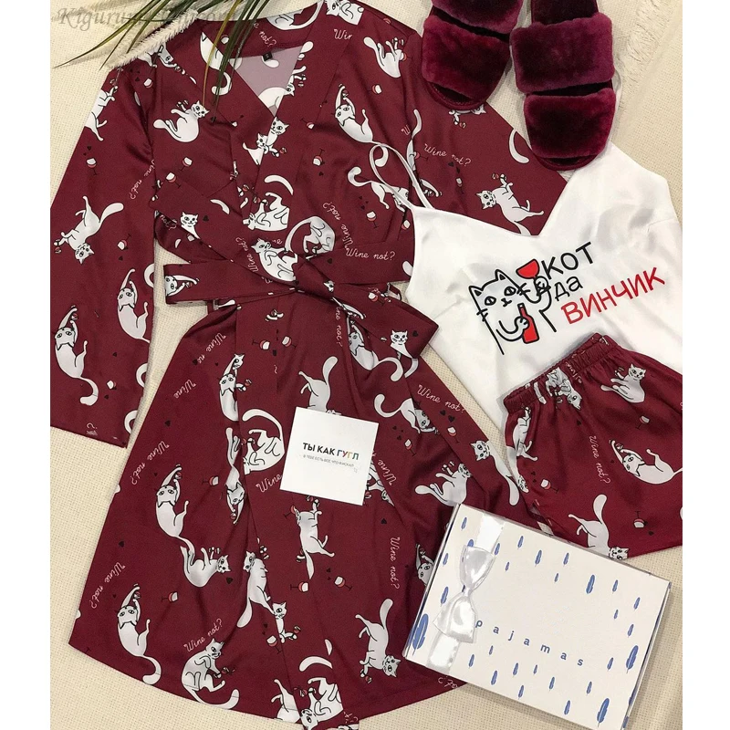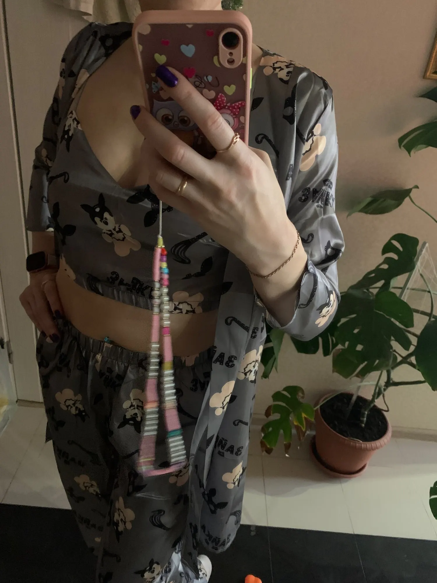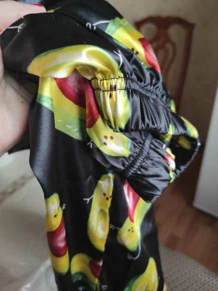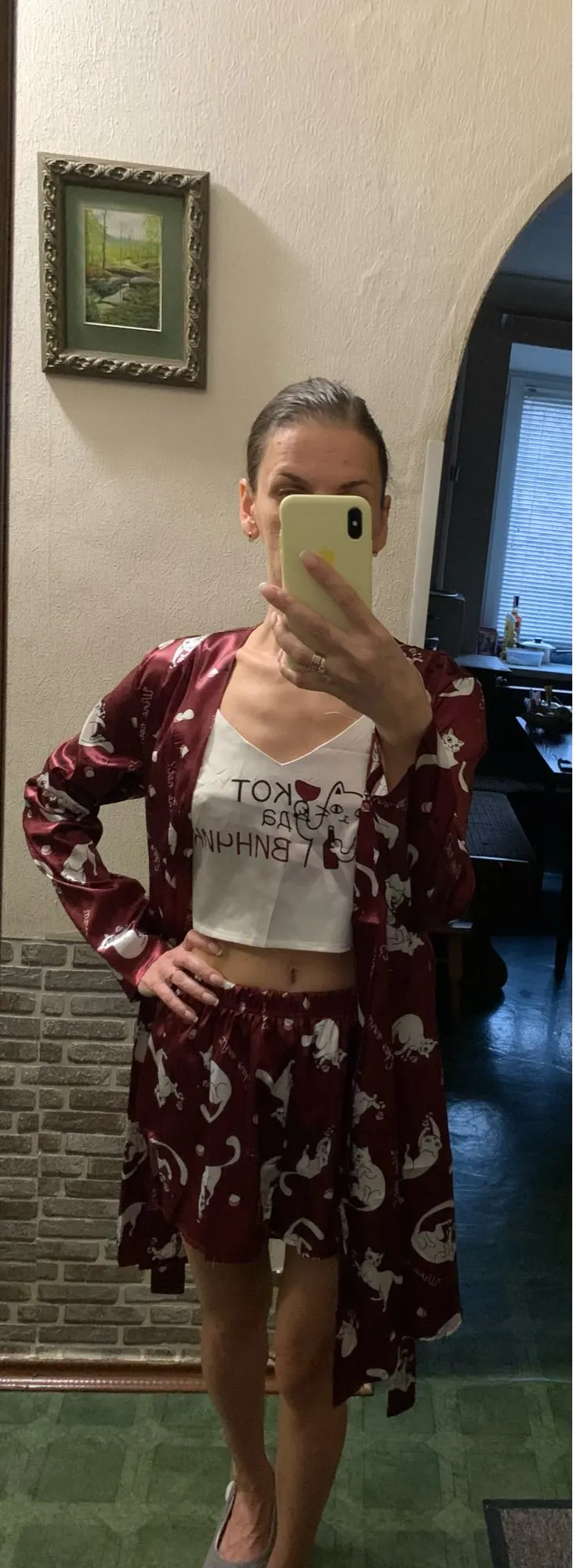 Ставлю 4 так как немного разочарована. Прочла отзывы и заказала, а лично мне пришла пижамка не мягкая , на ощупь она как будто накрахмалена, грубовата, не скажу что ужасного прям качества, но не мягкая, я у другого продавца брала на али, так там пришла реально приятная к телу. Ещё из неприятных моментов: готовьтесь к тому что топ очень короткий, ни спину ни живот нормально не прикрывает, лямки из дешёвой фурнитуры, очень скоро растянуться( и на шортах есть сбоку нелепой формы разрез, его по фото товара видно не было).В целом принт интересный, но эти три детали( разрез на шортах, лямки дешёвые и плотность ткани) меня не обрадовали. Всегда писала приятные отзывы и первый мой не столь приятный, просто хочу предупредить о моментах, которые не все описывают в отзывах.Мои параметры 86/62/86 брала себе xs мне по размеру подошло всё ( только топ коротковат, но думаю это модель такая), длина рукава на халате длинная, не 3/4 как описано в этом цвете
