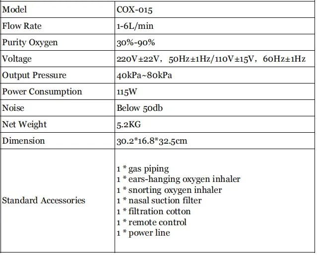 Модель: COX-015Номинальное напряжение: 110 В переменного тока/220 В 50 ГцМетод кислорода: PSA седьмого поколенияВходная мощность: 105 ВтИнгаляция: Тип гарнитуры, трубка для носаШум: ≤ 48 дБСодержание кислорода: 30% -90%Размеры изделия: 302 × 168 × 325 ммВыход газа: три ЭКУЧистый продукт Вес: 5,2 кгОтрицательные ионы кислорода: ≥ 6 миллионов частиц/см³Управление дисплеем: светодиодный дисплей таймера, интеллектуальное управление чипом
