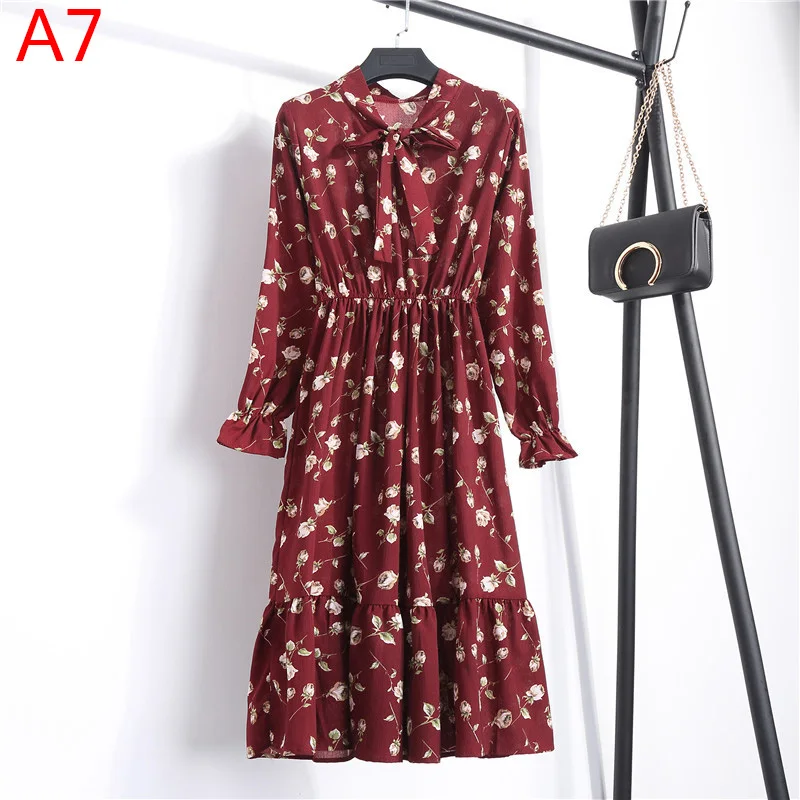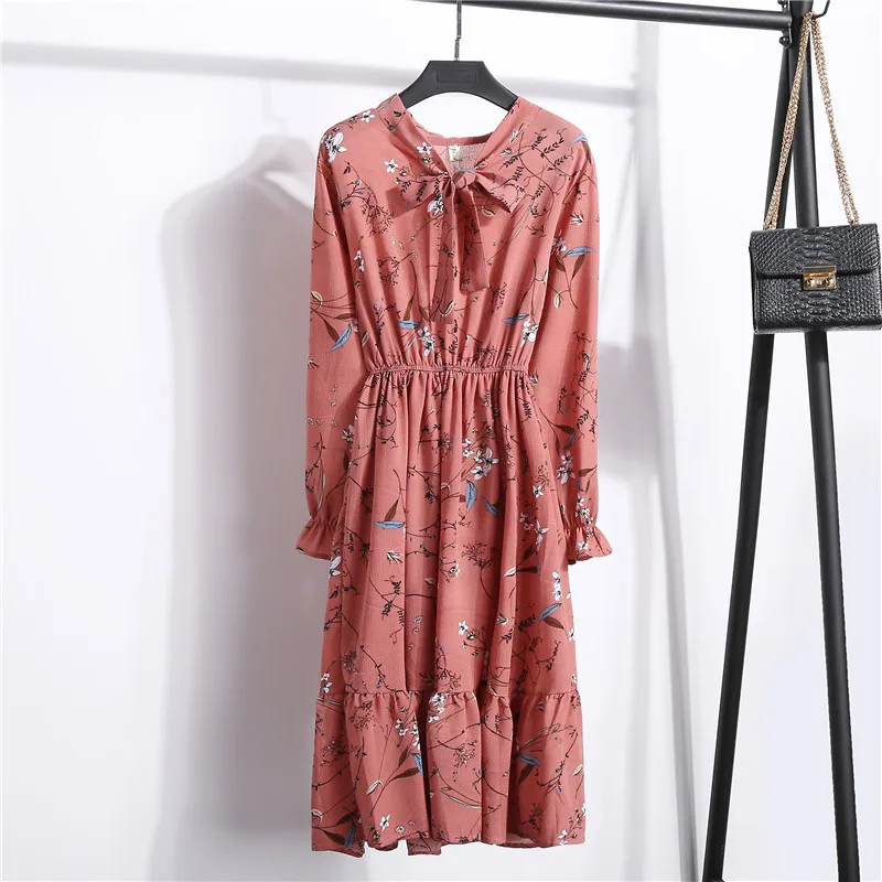Женское шифоновое платье-рубашка средней длины, повседневное винтажное платье с цветочным принтом, длинным рукавом и бантом, весна-осень 2021