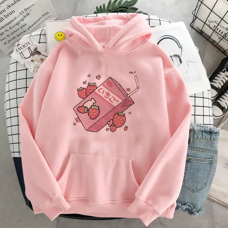 Женские толстовки с капюшоном, пуловеры с рисунком клубники и молок...