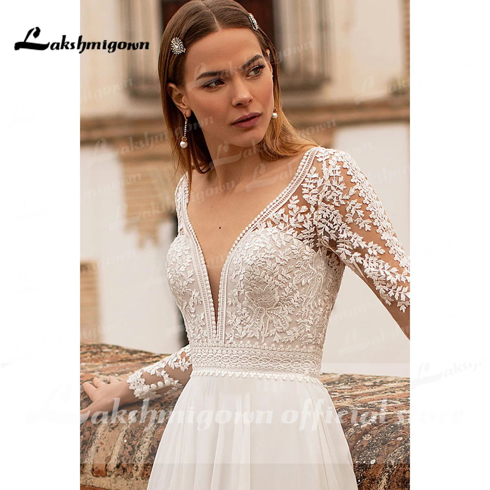 Классическое Свадебное Платье трапециевидной формы, кружевное шифоновое платье с длинным рукавом и аппликацией, свадебные платья до пола со шлейфом и V-образным вырезом