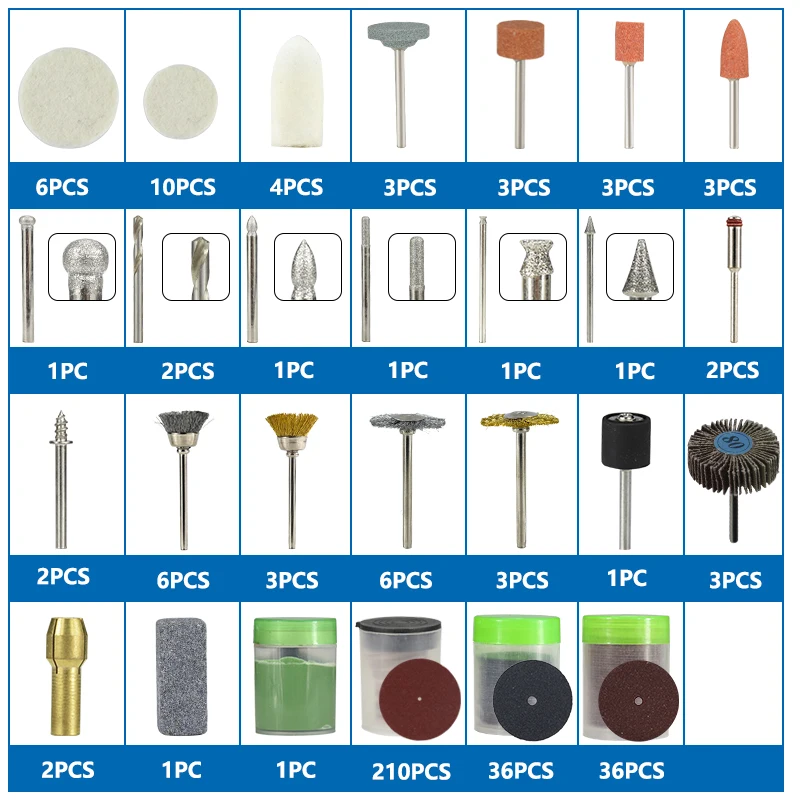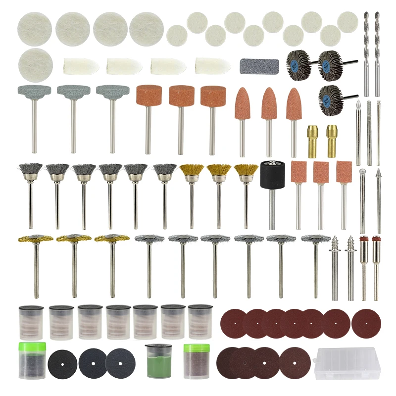 5. Эти электрические наборы для полировки имеют шлифовальную пасту, шлифовальный камень, наждачную бумагу, шлифовальный круг, полировальную пасту, нейлоновую щетку, стальную проволочную щетку, сверлильные Шатуны и т. д.