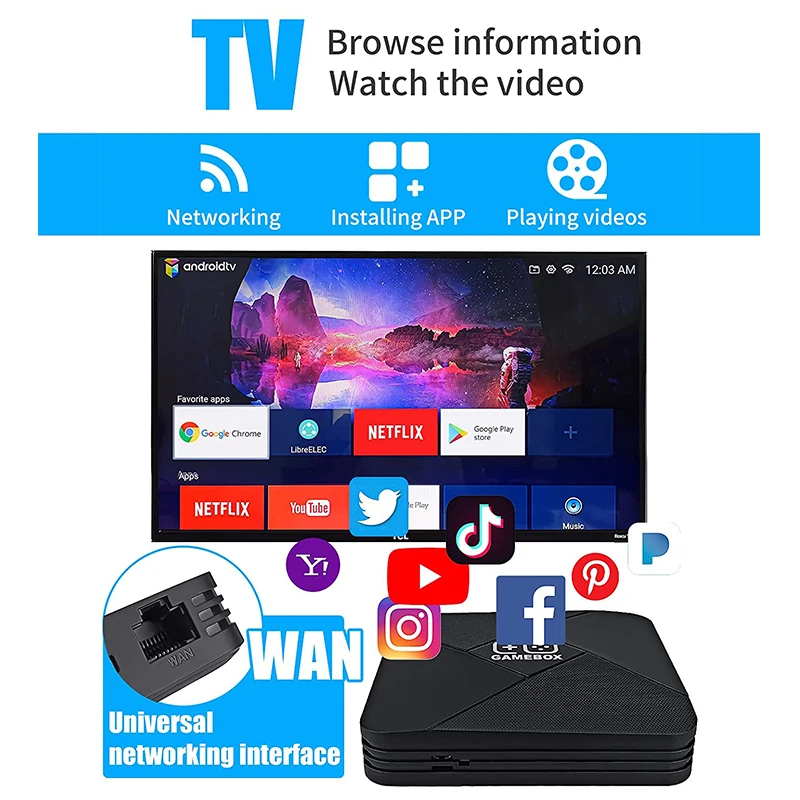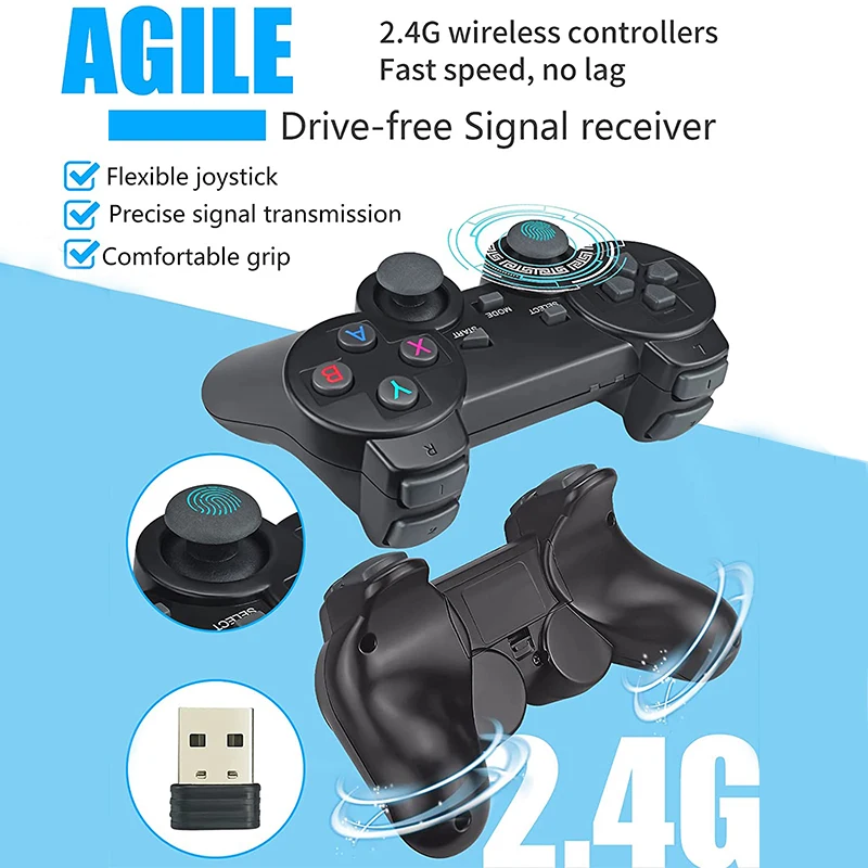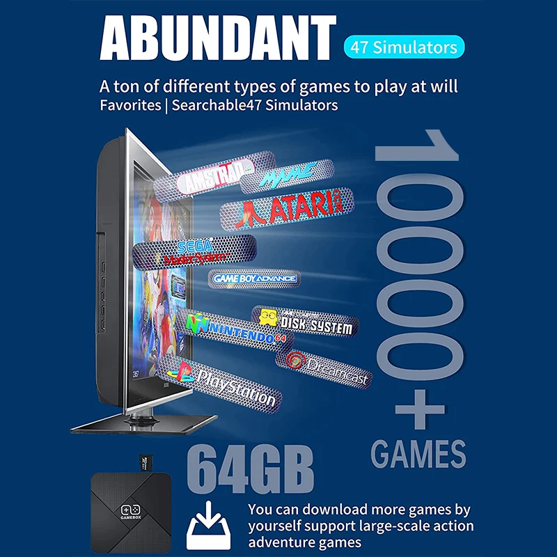 Особенности:【Свободно переключайтесь между TV и game】эта Игровая приставка не только встроенными играми 10000 +, но также совместима с системой Android TV 9,1 и оснащена специальным пультом дистанционного управления TV. Универсальный порт WAN может подключаться к сети, вы можете смотреть видео онлайн на YouTube, а также загружать больше приложений в Google Play.【 47 симуляторов 】 30000 + игры распределены в 47 эмуляторах, вы можете найти игры, которые вы хотите в системе и собрать Ваши любимые игры. В то же время, вы можете скачать новые игры на tf-карту. До тех пор, пока формат игры разрешен, даже масштабные экшен-игры могут работать без лагов.【 2,4G беспроводной двойной контроллер 】эта Беспроводная Ретро игровая консоль со встроенными играми поставляется с двумя 2,4G беспроводными контроллерами, без лагов, без замораживания. Поддержка 1 или 2 человек, чтобы играть в игру, эффективное расстояние 30 футов. Избавьтесь от ограничений линии подключения и свободно Играйте в игры!【 4K HDMI HD выход/Plug & play】подключен через кабель HDMI, установка проста и удобна, просто подключите телевизор, компьютер, проектор и другие устройства с интерфейсом HDMI, вы можете играть в классические игры 10000 +. Дисплей 4K HD, Наслаждайтесь игрой с семьей и друзьями.Спецификация:Обновленная модель 4 Гб ОЗУ 64 Гб хранение 2в1 Android TV box система + Linux Игровая приставка система 10000 классические игрыПоддержка системы LINUX MAME/FC/FCE/SFC/GB/GBA/GBC/MD/PS1/PSP/DC/PSПоддержка системы Android: Google Play Store, Youtube, KODI и многие другие приложения android.Android системные спецификации:Android 9,1Amlogic S905L процессор4 ГБ ОЗУ 64 Гб памяти.WIFI IEEE 802,11 a/b/g/n 2,4 ГГцПосылка включает в себя:1 х игровой ящик G52 беспроводных контроллера (2 аккумулятора AAA)1 х USB donggle для джойстика1X10000 + игровая карта Micro SDПульт ДУ (1 шт.);1 х разъем питанияРуководство пользователя-1 шт.;