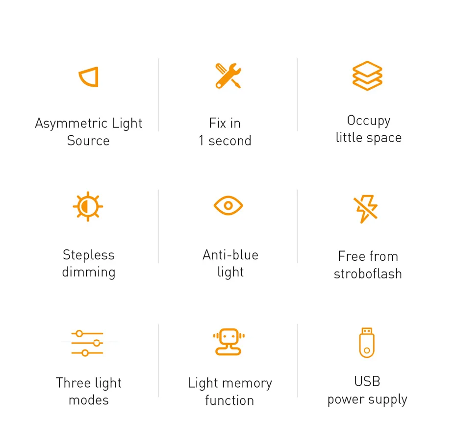 1. Светильник с функцией памяти; Анти-синий светильник; Без стробоскопа2. С плавной регулировкой; Три светильник режимов; Зарядка от USB источника питания3. Простой корпус лампы; Занимает мало места; Фиксируется в течение 1 секунды