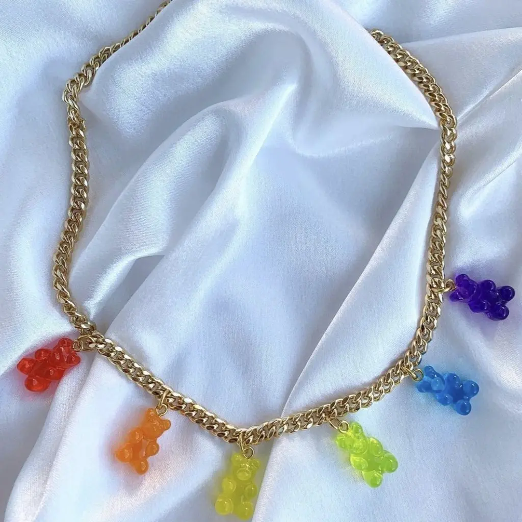 Juan, конфетный цвет, ожерелье с медведем из смолы для женщин, имитация жемчуга, цепочка, бусы, колье, звено, неоновый, зеленый, желтый, ювелирное изделие, богемное, милое