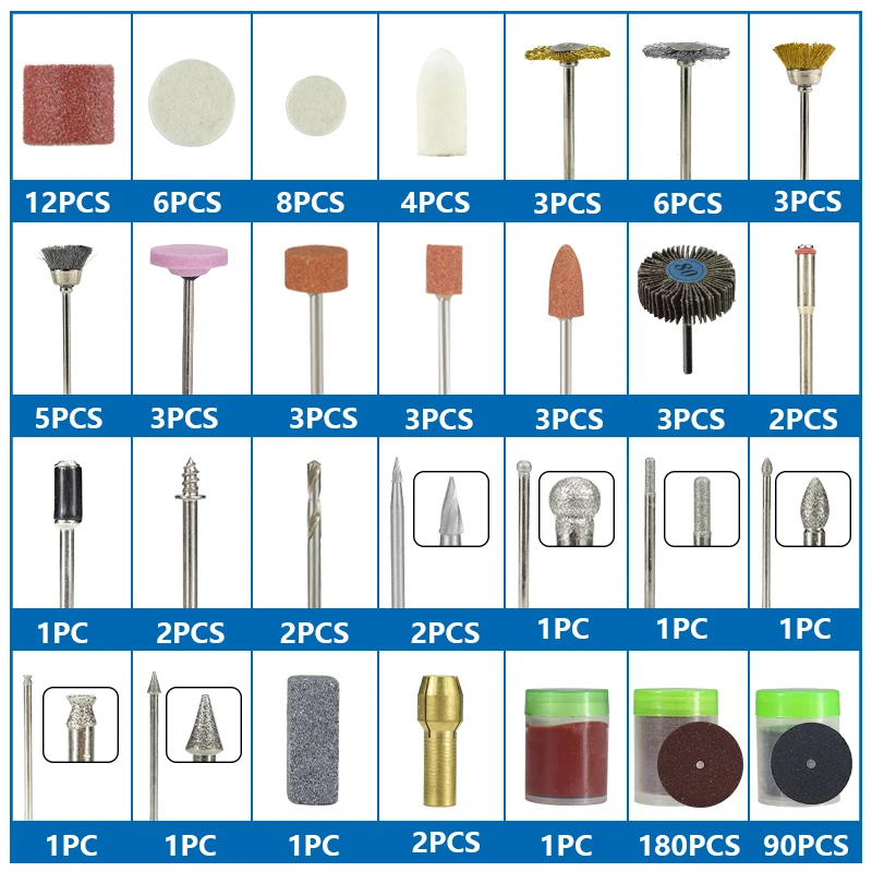 5. Эти электрические наборы для полировки имеют шлифовальную пасту, шлифовальный камень, наждачную бумагу, шлифовальный круг, полировальную пасту, нейлоновую щетку, стальную проволочную щетку, сверлильные Шатуны и т. д.