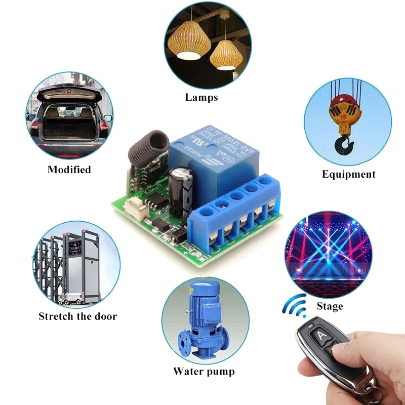 Область применения продукта Продукты могут быть использованы в домах, фермах, фабриках, офисах, лабораториях, супермаркетах и так далее.Гаражные ворота с дистанционным управлением \ электрические двери \ домашние двери \ двери затвора \ раздвижные двери \ ворота \ дорожные воротаЭлектрический занавес с дистанционным управлением \ водяной насос \ вентилятор \ лампа \ светодиодный светильник \ лампа \ вентиляционное устройство \ передача сигнала Посылка включает в себя Релейная плата ресивера (с корпусом)Пульт дистанционного управления (с батареей)Руководство по эксплуатации