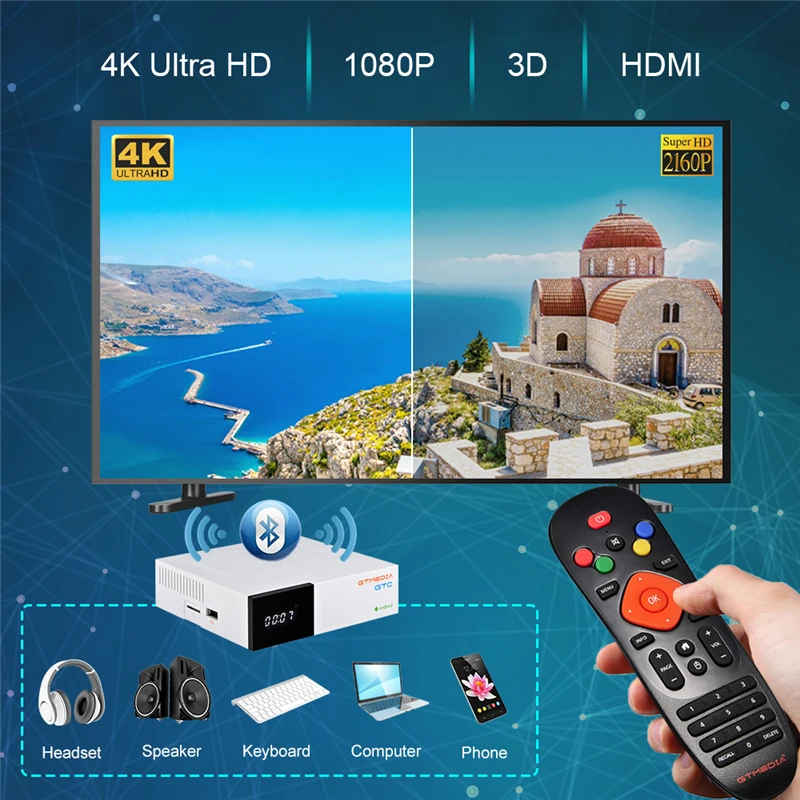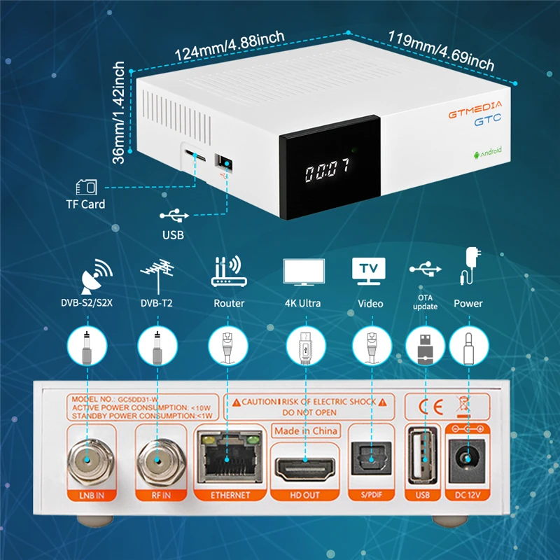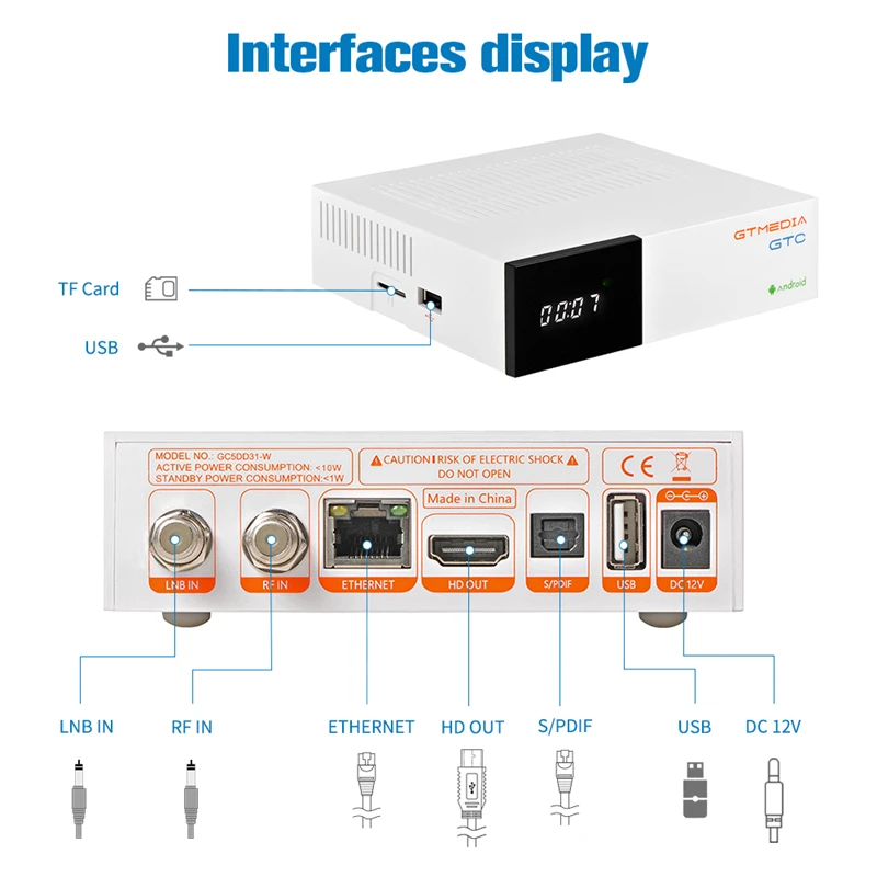 1. Android 9.0 TV BOX + DVB-S/S2/S2X,DVB + T/T2/Cable/ATSC-C(J.83B)/ISDBT, AVS +HEVC main 10 profile(10 бит),AUTO BISS,T2MI,GTFeeds,YUV422,Gtshare2. Amlogic S905X3 2GBRAM + 16GBROM3. Поддержка 4K ультра-высокой четкости дисплея и декодера, двухъядерный процессор MIPS75Kf;4. Поддержка Unicable, DiSEqC1.0/1,1/1,2/USALS мотор полностью поддерживает;5. Поддержка полного ключа PowerVu, DRE & Biss; AUTO BISS6. Встроенный Wifi 2,4G/5G + BT4.1, 802.1.1b/g/n/ac7. Система является GT UI, GTStore Addons предустановленной.Netflix, Youtube, Prime-Video, Disney Plus, онлайн-фильмы и т. Д.Поддержка SAT2 IP, GTshare APP8. Поддержка, декодирование карт NEWCAM, MGCAM и CA;