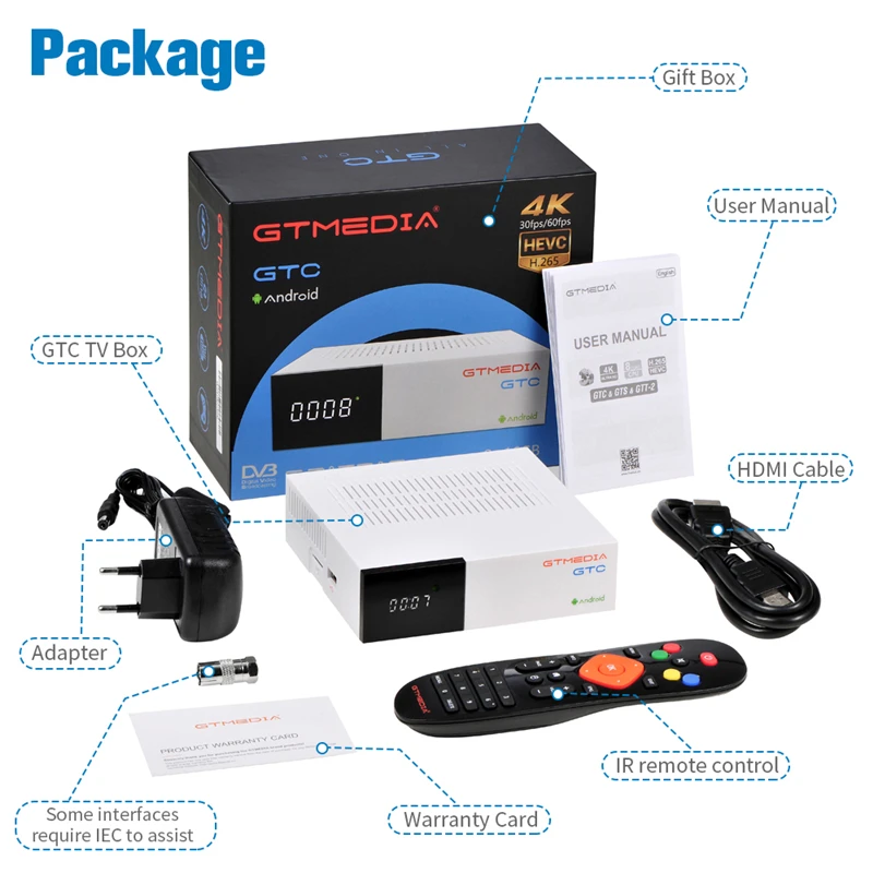 -1 x ТВ-приставка GTMEDIA GTC-1 пульт дистанционного управления-Источник питания-1 шт.-Кабель HDMI-1 шт.-Руководство пользователя-1 шт.