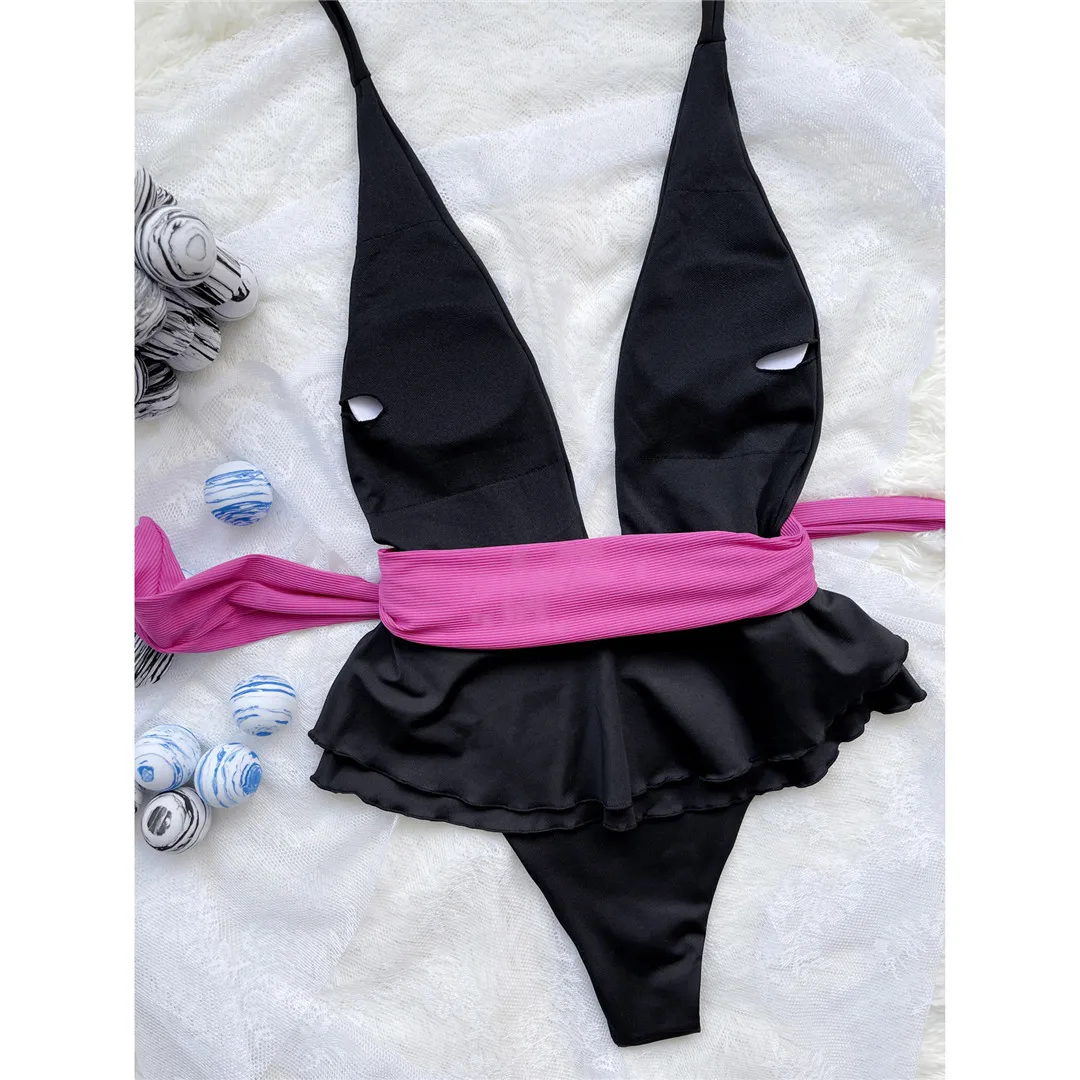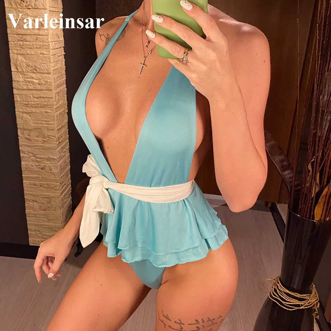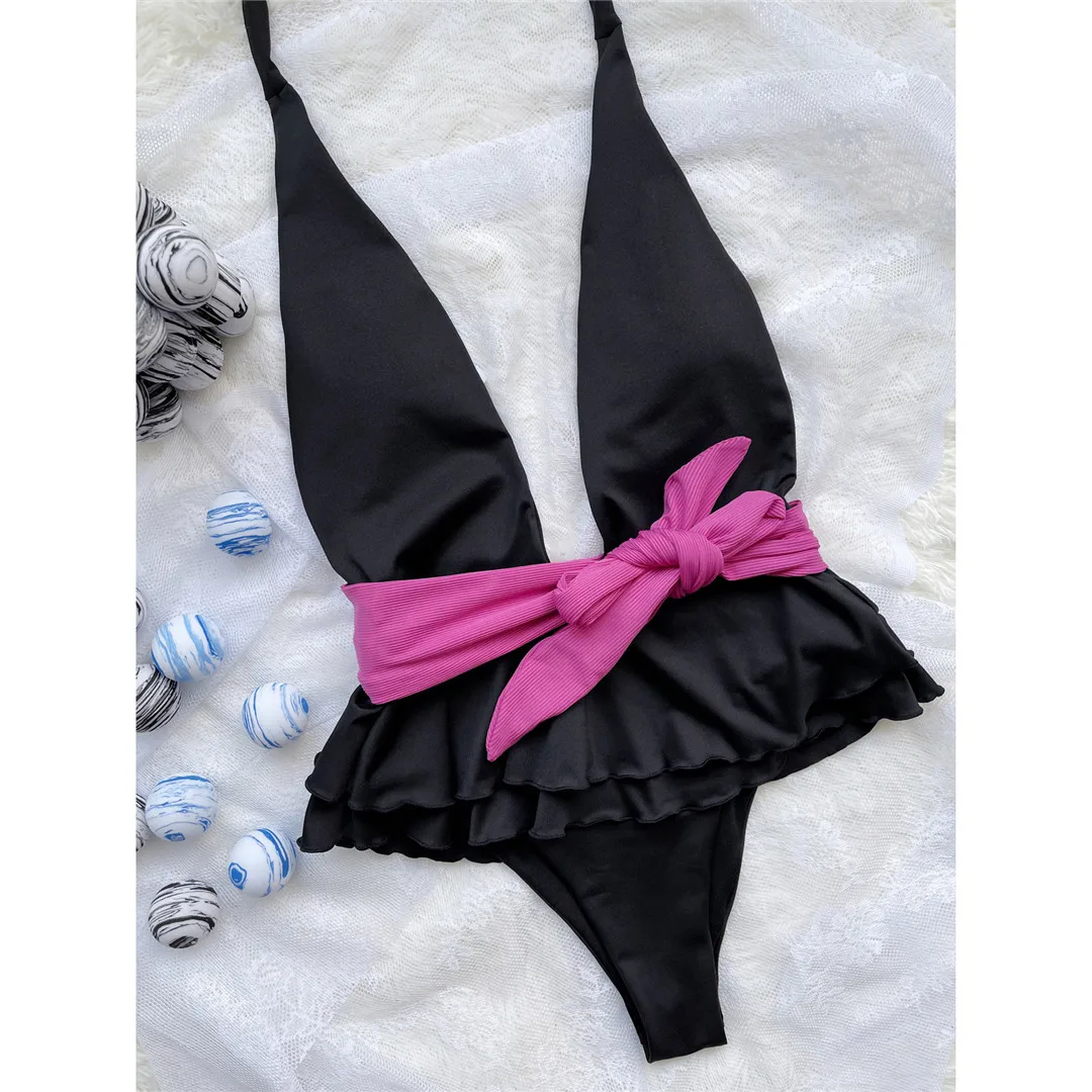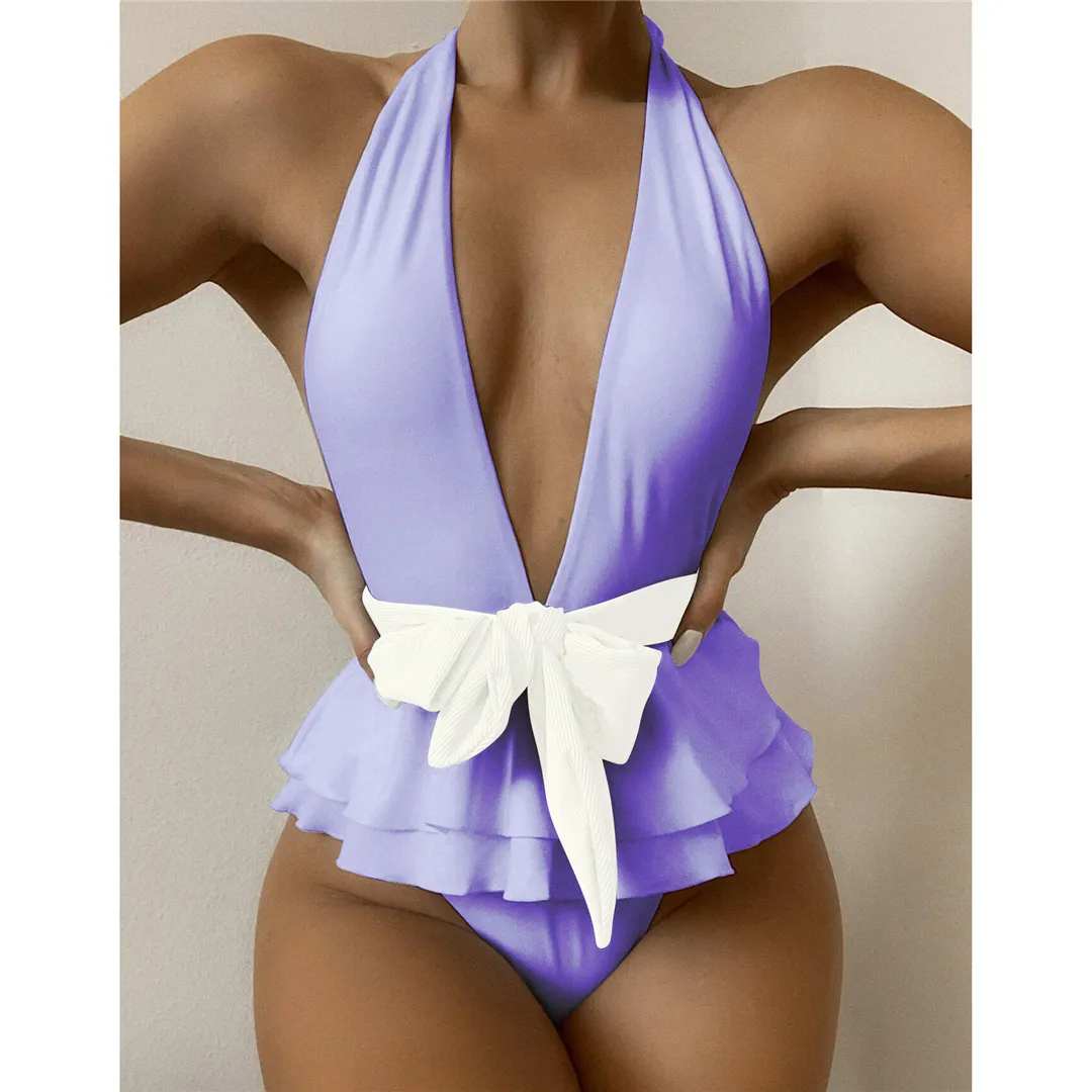 Сексуальный гофрированный Глубокий V Монокини Цельный купальник женский купальный костюм с повязкой на шее Мягкий купальный костюм V3169G
