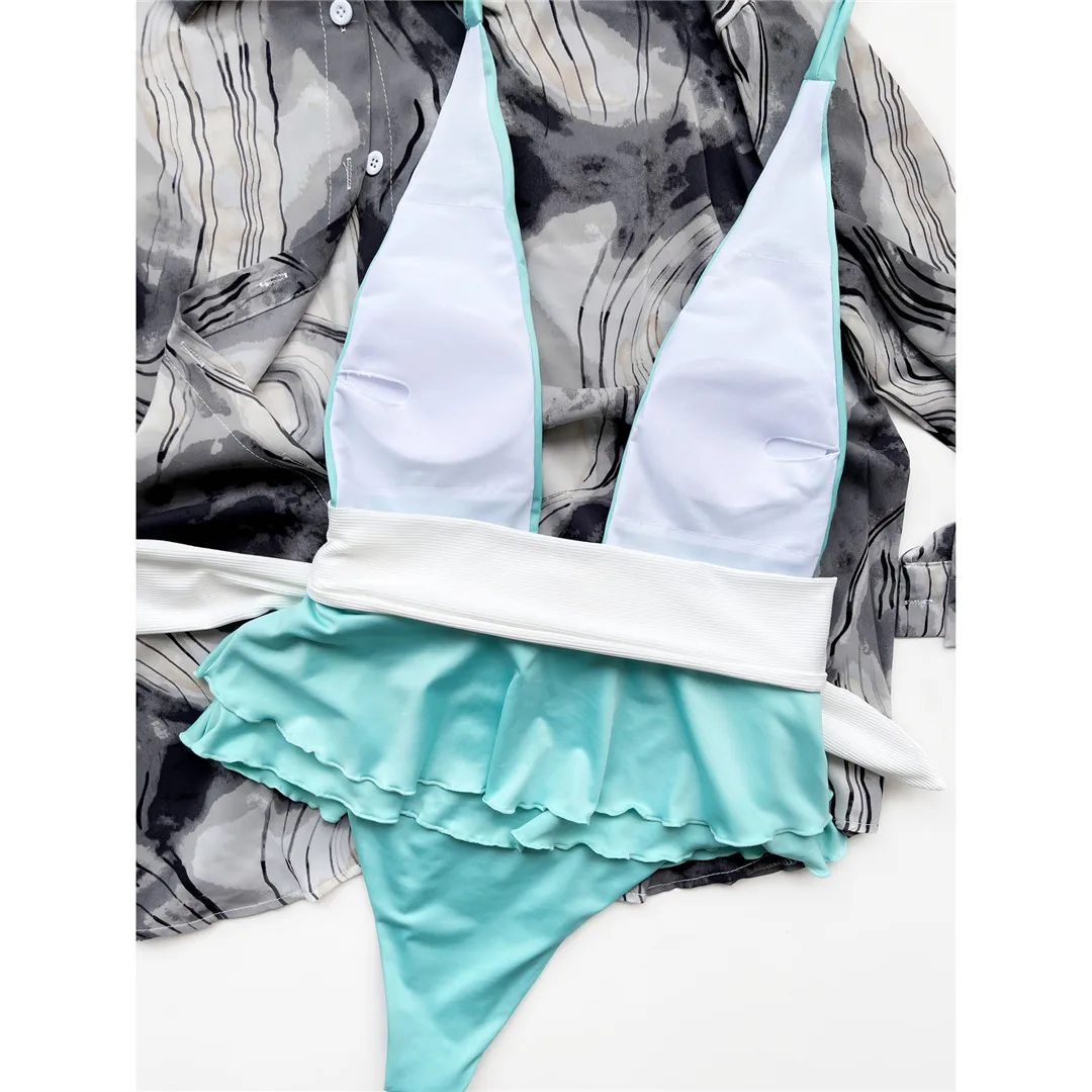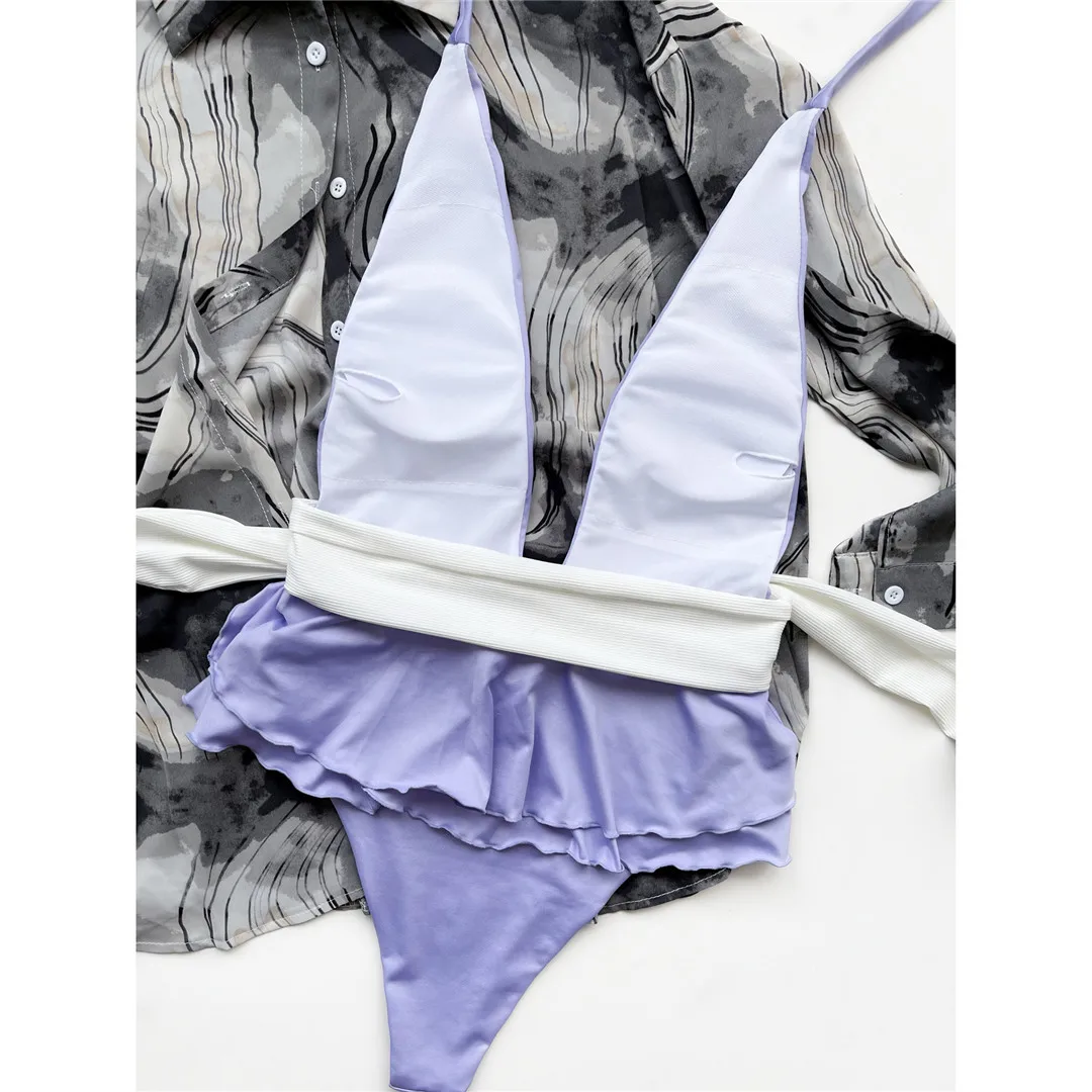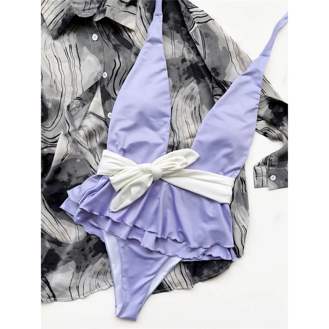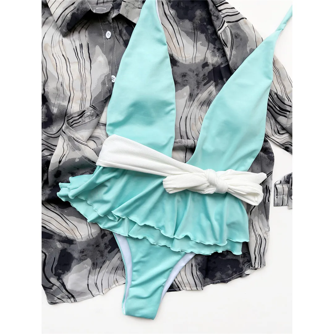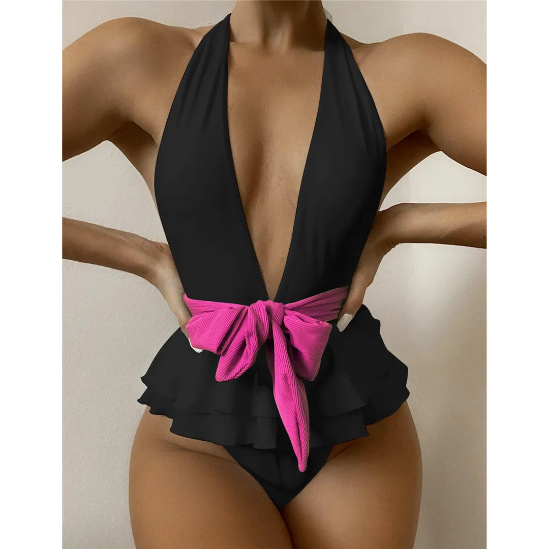 Сексуальный гофрированный Глубокий V Монокини Цельный купальник женский купальный костюм с повязкой на шее Мягкий купальный костюм V3169G