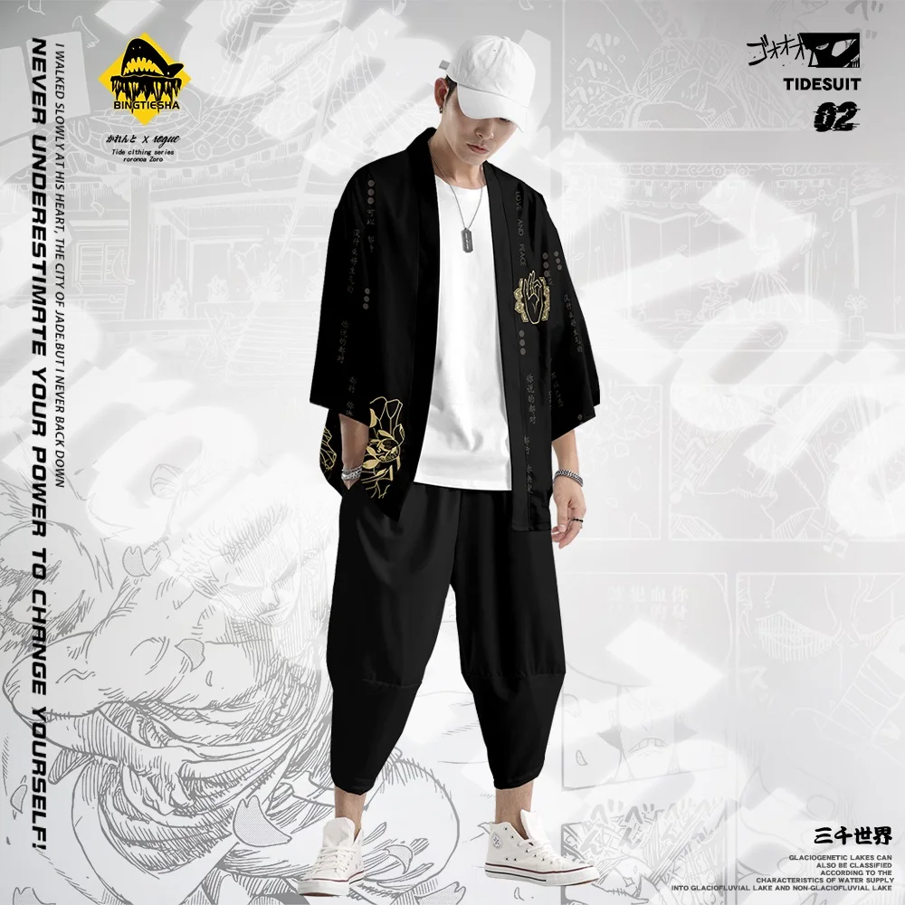 Традиционное японское кимоно для мужчин и женщин, кардиган с аниме хаори, японское летнее кимоно, костюм с укороченными брюками
