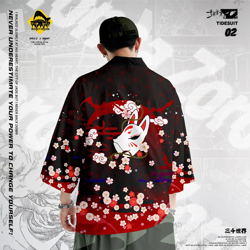 Традиционное японское кимоно для мужчин и женщин, кардиган с аниме лисьей маской, японское летнее кимоно, костюм из девяти точечных брюк