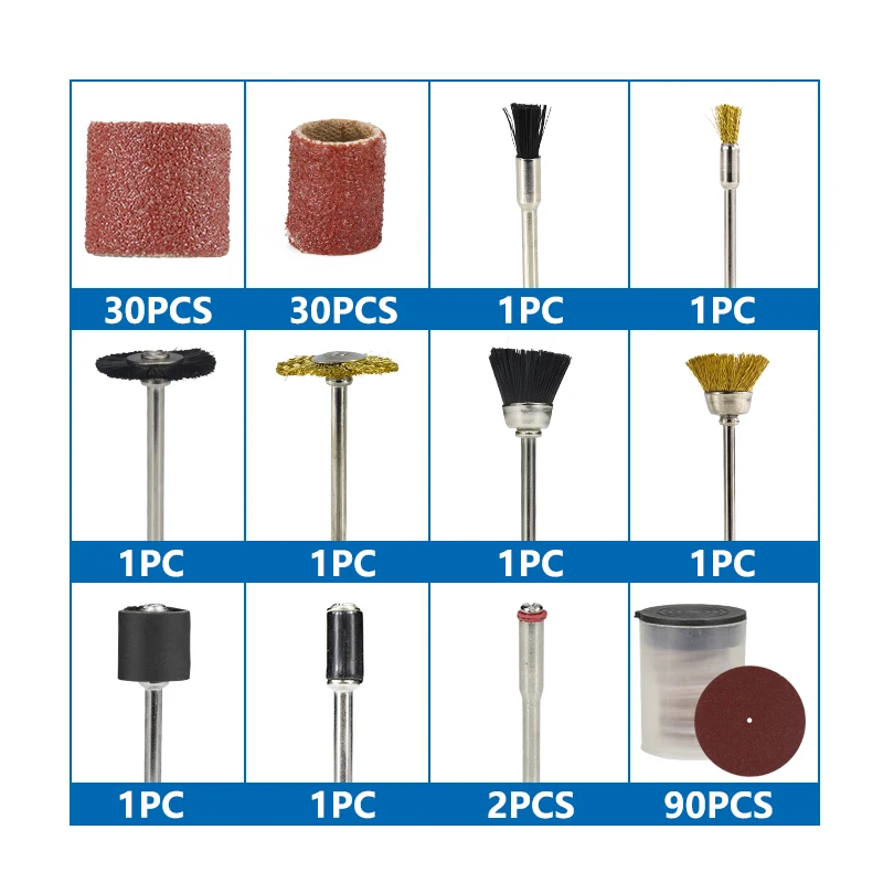 5. Эти электрические наборы для полировки имеют шлифовальную пасту, шлифовальный камень, наждачную бумагу, шлифовальный круг, полировальную пасту, нейлоновую щетку, стальную проволочную щетку, сверлильные Шатуны и т. д.