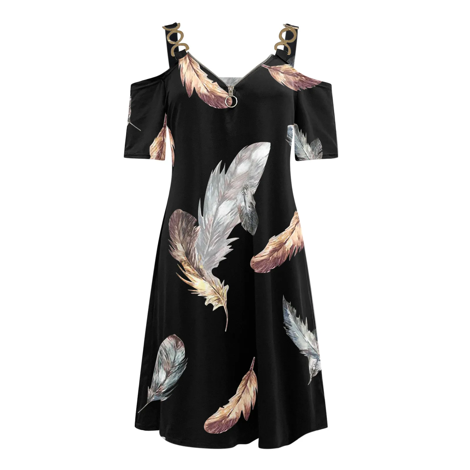 Женское короткое платье с принтом перьев, Повседневное платье на молнии с V-образным вырезом, коротким рукавом, бретельками и открытой спиной, лето 2022