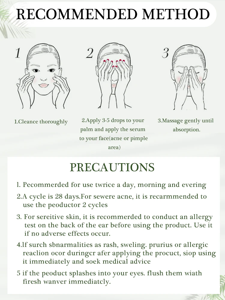 1. Используйте освежающее очищающее средство для лица чайного дерева для очистки кожи;2. Положите две-три капли на ладонь и нанесите кончики пальцев на лицоИ шеи;3. Мягко нажимайте вверх и массируйте до впитывания;4. Избегайте контакта с глазами.