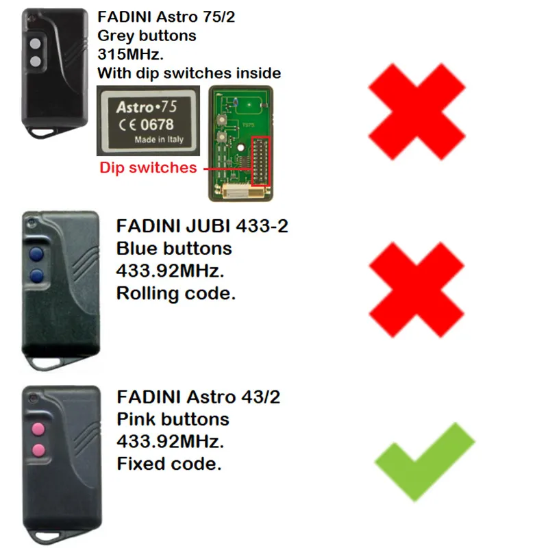 2260(PT2260,SC2260,LX2260,HX2260); 2262,(PT2262,SC2262,LX2262,HS2262,HX2262),PT2264,PT2240(LX2240),1527( EV1527, 1527,HX1527 ),FP527,CS5211,SMC918,SMC926,AX5026,AX5326-3,AX5326-4,HT600,HT680,HT6207,HT6010,HT6012,HT6013,HT6014,HT12D, ht646f49fpice, PIC16F630 и так далееПроцесс клонирования возможен только в том случае, если у вас есть один оригинальный пульт дистанционного управления, и он находится в хорошем рабочем состоянии. Не путайте эту модель с двумя разными частотами и кодированием. Убедитесь, что частота правильная 433,92 МГц. Убедитесь, что ваш оригинальный пульт дистанционного управления имеет dip-переключатели внутри. Убедитесь, что ваш оригинальный пульт дистанционного управления имеет кнопки желтого цвета.