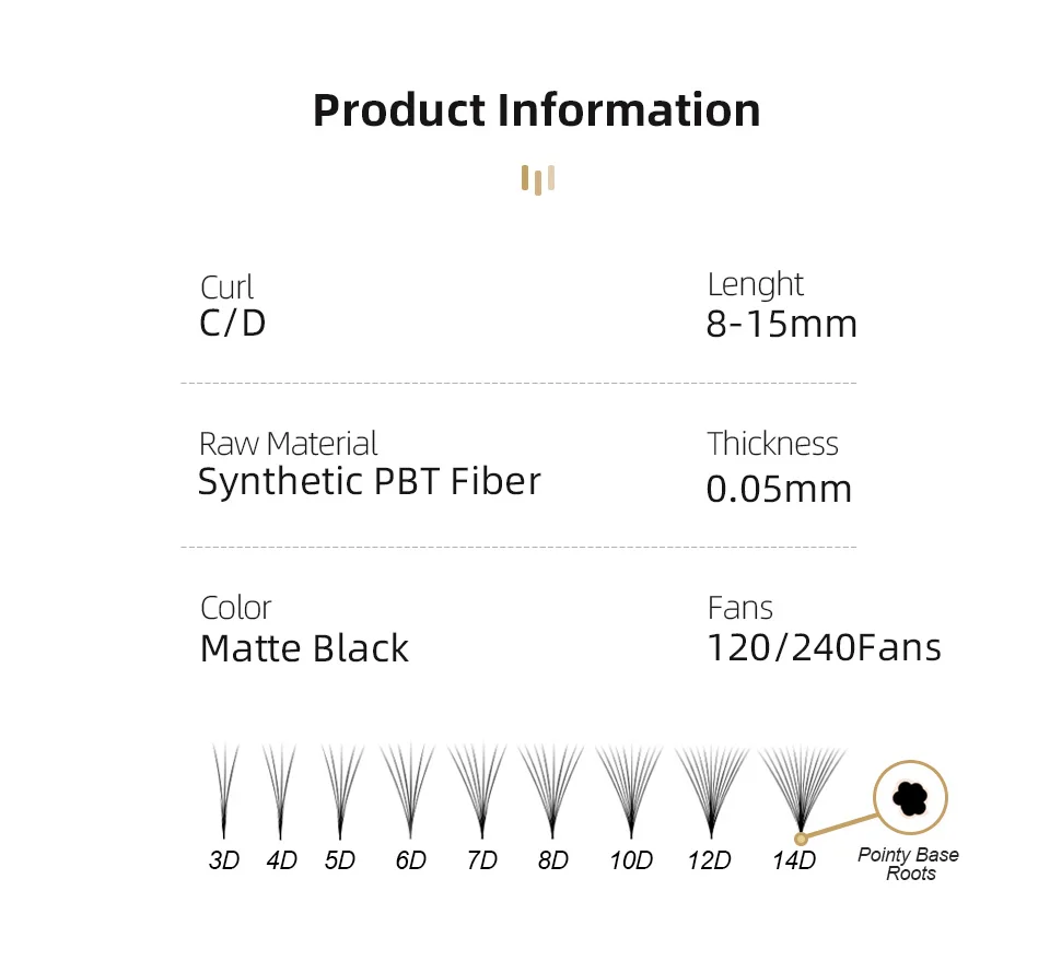 Цвет: матовый черный Материал: Корейский ПБТ Толщина: 0,05 мм Длина: индивидуальный 8-15 мм Количество: 12 рядов/лотков Curl: C D Вентиляторы для ресниц: 3D: 12 линий * 20 вентиляторов = 240 вентиляторов в лоткеДругие: 12 линий * 10 вентиляторов = 120 вентиляторов в лотке