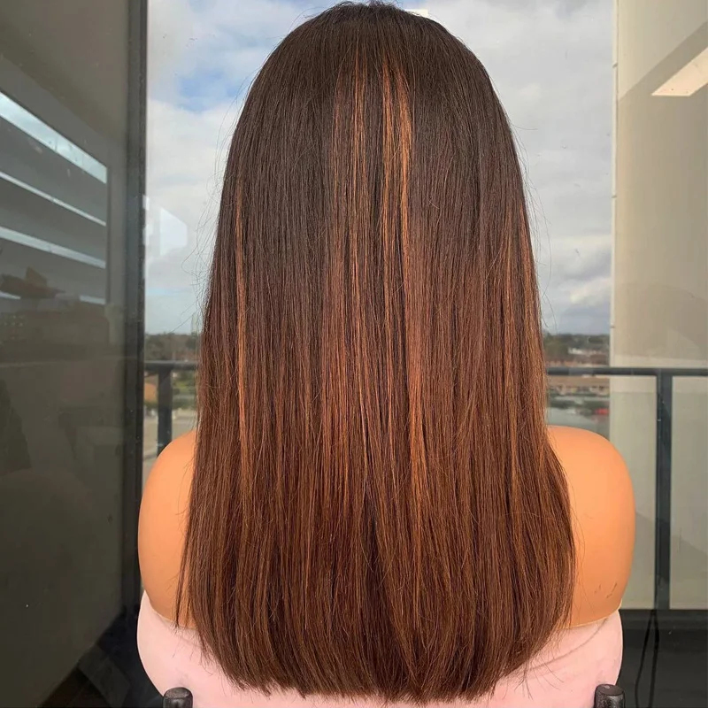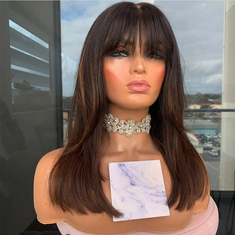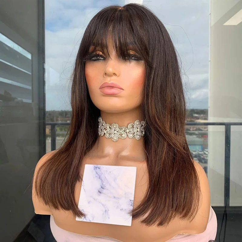 Прямые каштановые Омбре шелковые парики с челкой, без клея, малайзийский шелк, топ, волосы для волос, парики, 150% плотность для женщин