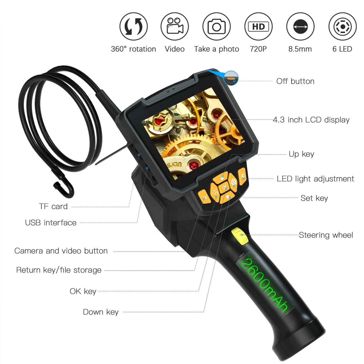 1,3-в-1 интерфейс передачи данных эндоскопическая камера (Тип-C/USB/MICRO SD) 2. Просмотр видео в режиме реального времени. Запись видео и запись изображения 3. Светодиодный светильник высокой яркости, пять регулируемых кнопок для камеры для быстрого фотографирования во время простого использования 4,180 или 360 градусов эндоскоп угол регулируемый запираемый одной рукой операции, быстро и удобно