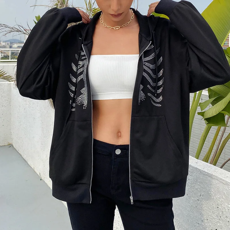 Y2K Стразы худи скелет Женская осенне-зимняя куртка с капюшоном на ...