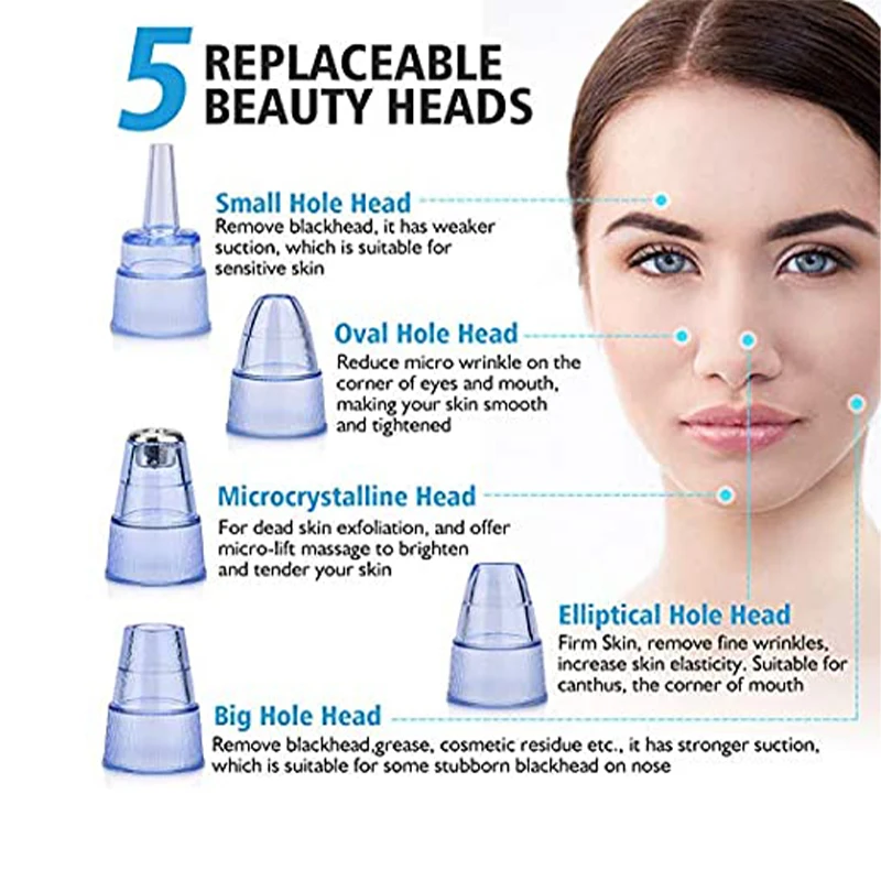 4. 5 всасывающих головок: этот пористый пылесос обеспечивает 5 различных головок присоски с различными функциями. Они могут удовлетворить различные потребности лица и решить различные проблемы