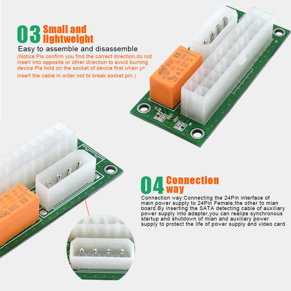 При одновременном подключении 5 графических карт к размахиванию монет, имеющегося источника питания недостаточно, источник питания высокой мощности отсутствует на складе, и цена довольно высока, вы можете использовать эту карту для включения и выключения двух источников питания одновременно, И распределите питание видеокарты на два источника питания, чтобы заменить источник питания высокой мощности.
