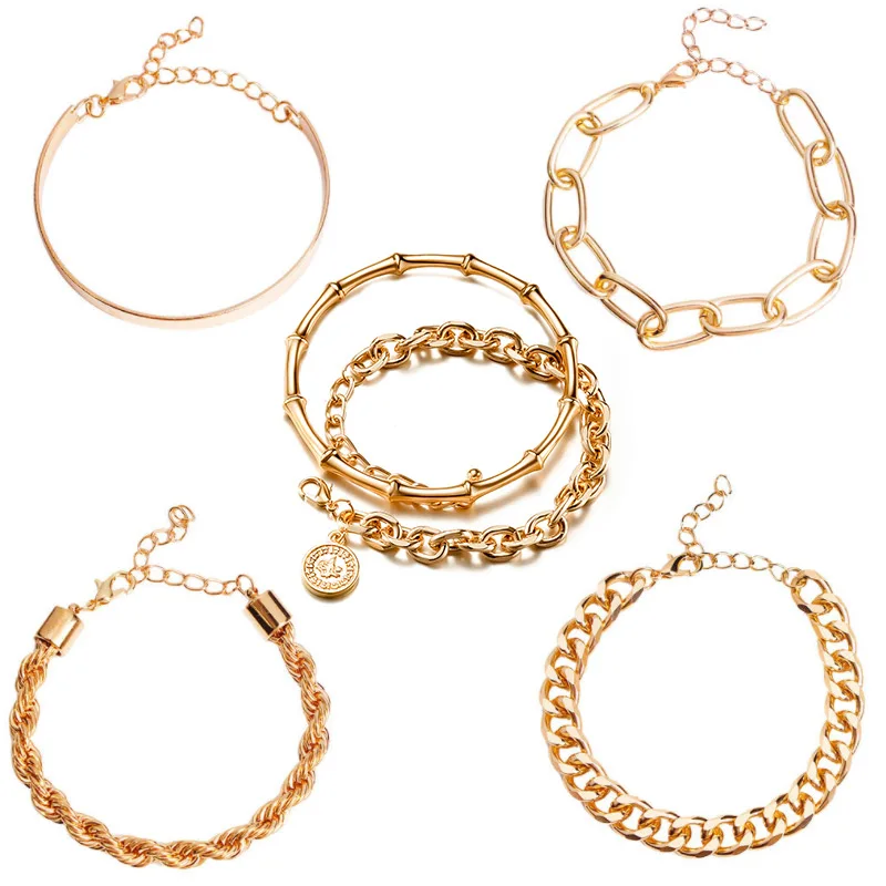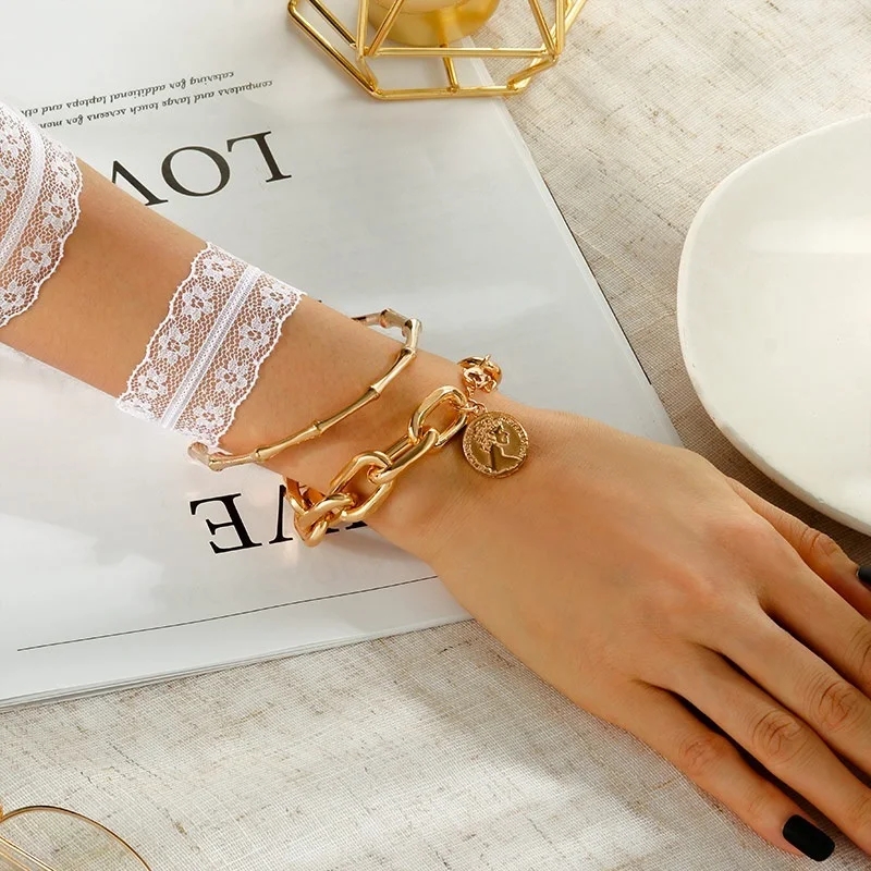 6 шт.компл. винтажный Модный большой толстый браслет-цепочка для женщин, звеньевой Золотой металлический Плетеный Браслет-цепочка, браслеты, ювелирные изделия