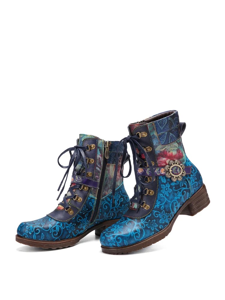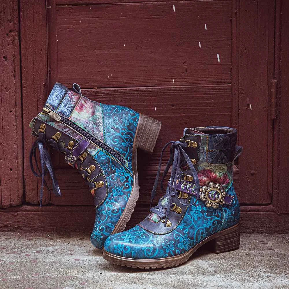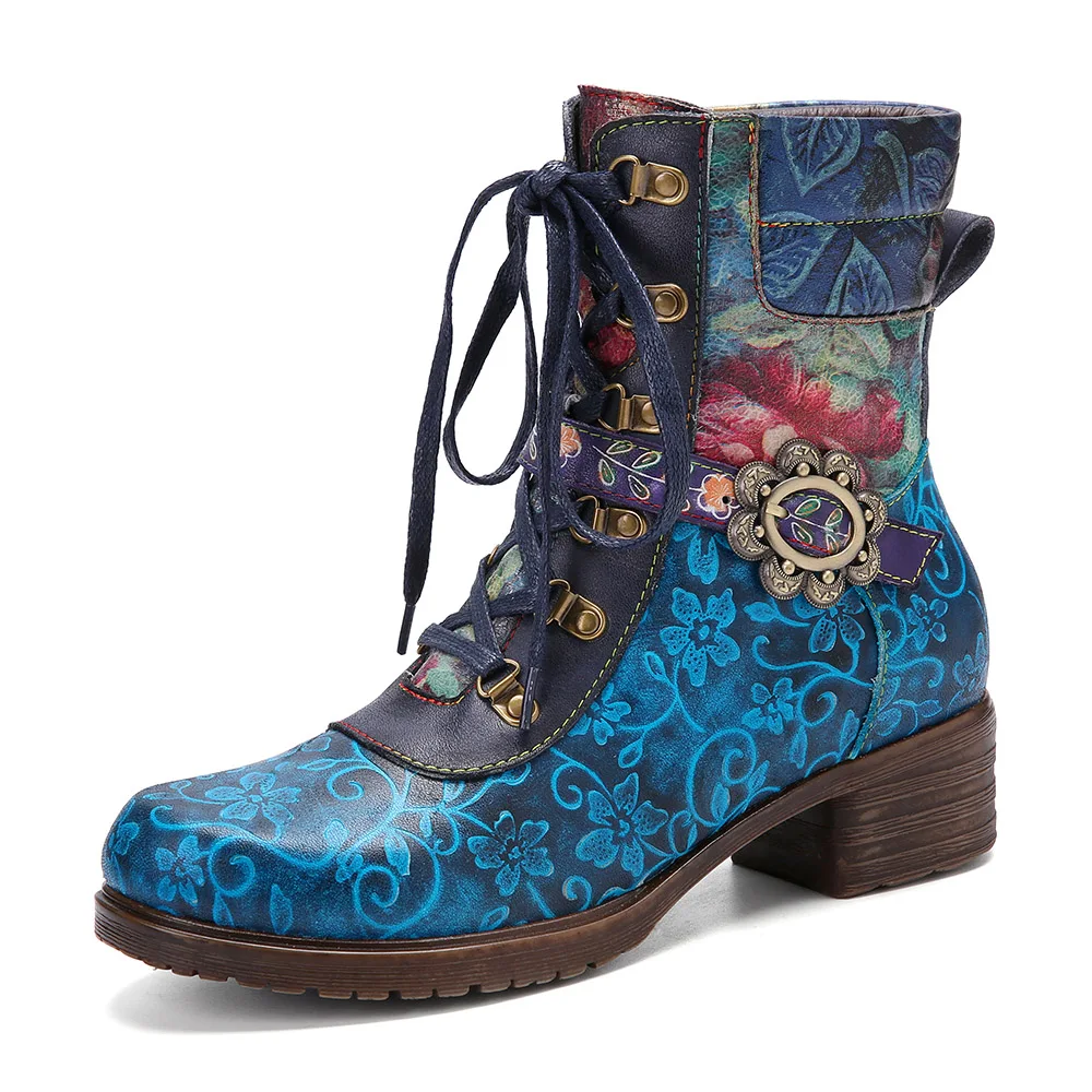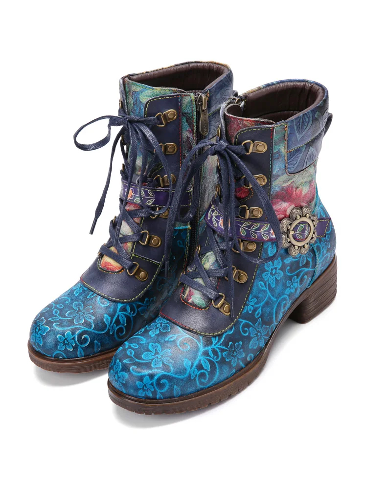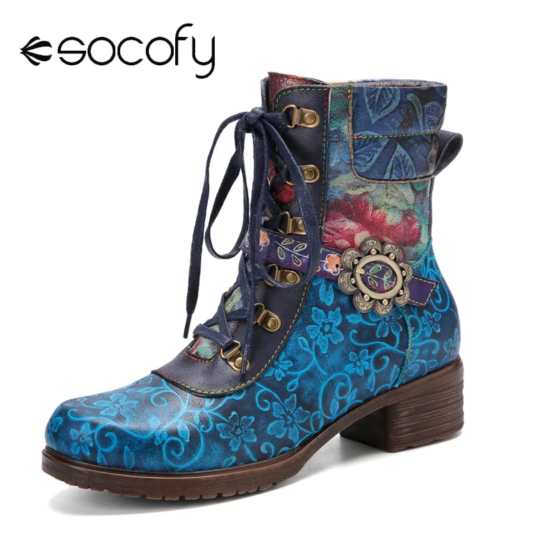 Socofyкороткие ботинки из натуральной кожи в стиле ретро с цветочным принтом, на шнуровке, с боковой молнией, на не сужающемся книзу массивном каблуке; Женская обувь на каблуке; Сезон осень-зима